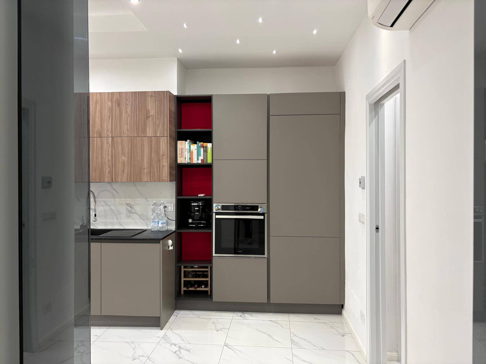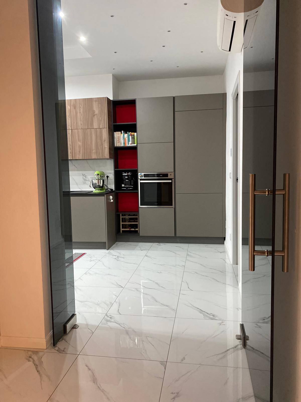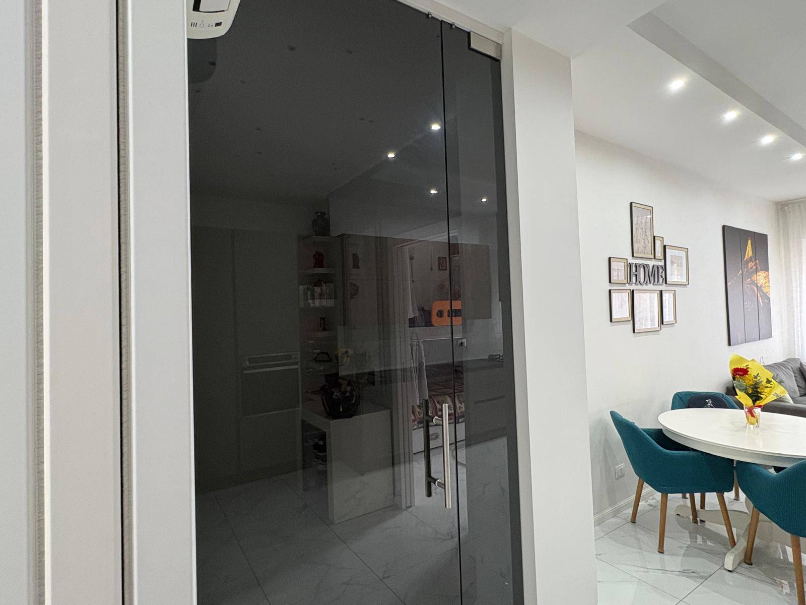 Lappartamento si apre su un ingresso impreziosito da una splendida porta scorrevole in vetro, che separa armoniosamente una delle due camere da letto dallampio soggiorno living con cucina a vista, creando un ambiente moderno e luminoso.