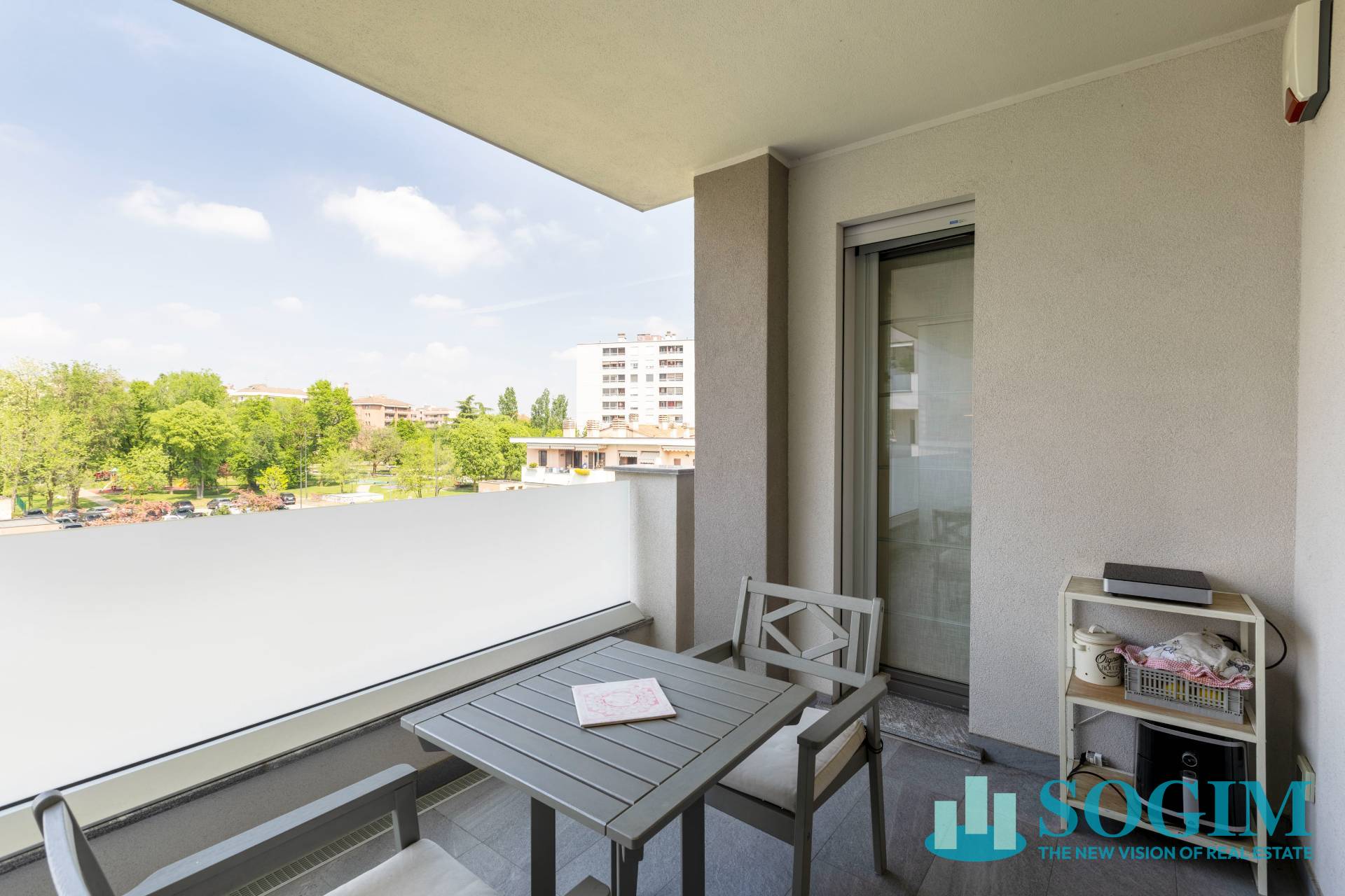 Il terrazzo di generose dimensioni e ideale per pranzi all'aperto o semplicemente per godere della vista aperta sul verde circostante.