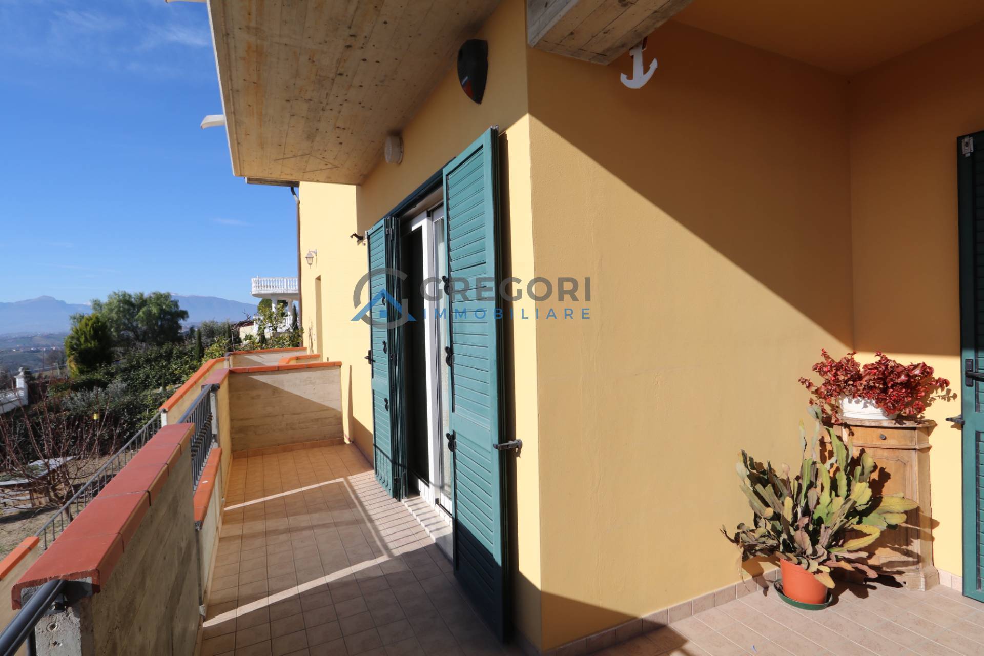 La sua posizione strategica offre una vista panoramica mozzafiato sulle colline circostanti e sul mare. La zona giorno composta da un luminoso soggiorno con caminetto, ampia cucina abitabile con stufa a pallet utilizzata per riscaldamento di tutto l'immobile, ampio balcone con comodo terrazzo vista mare, ideale per trascorrere piacevoli momenti all'aperto.
