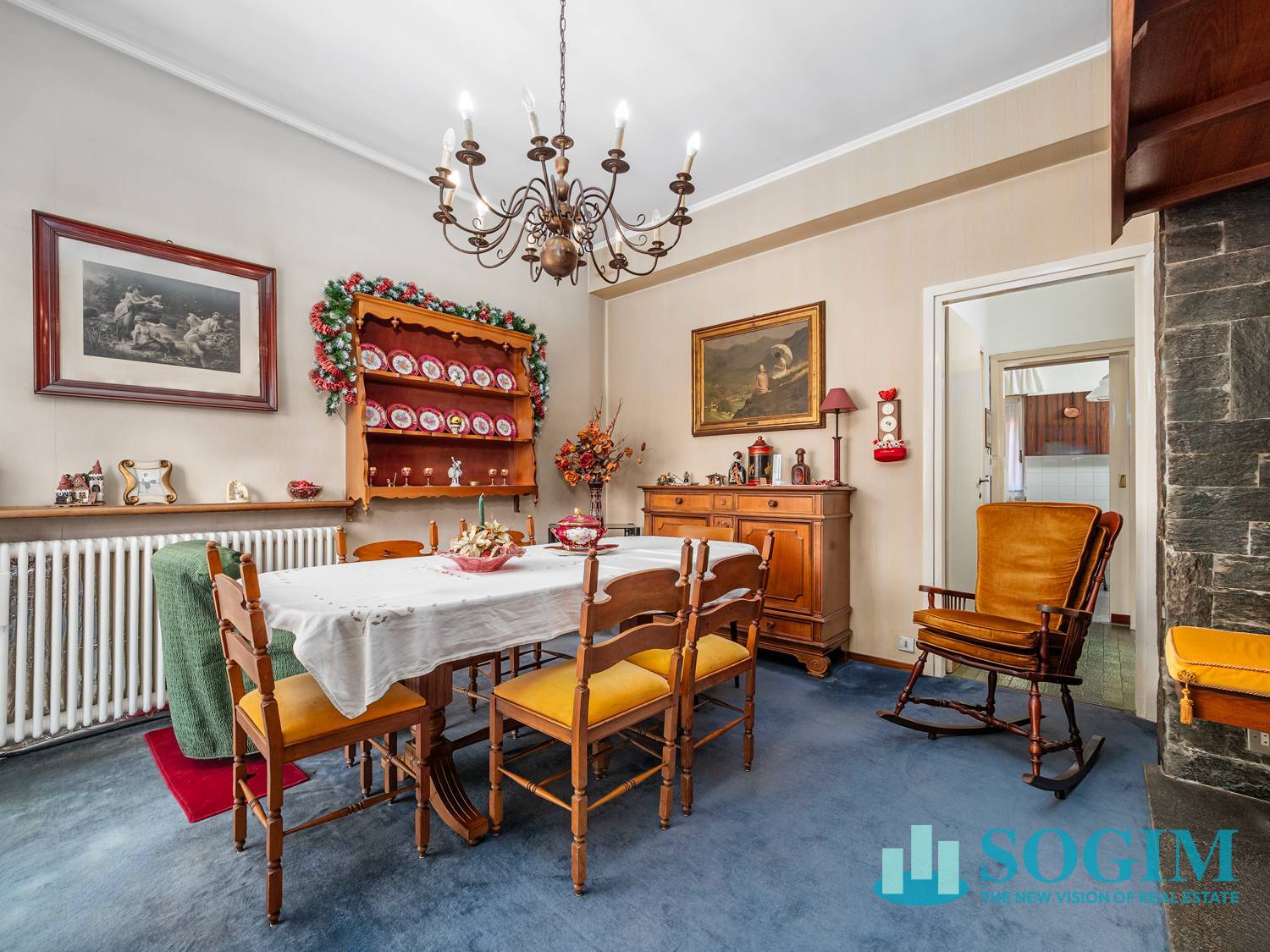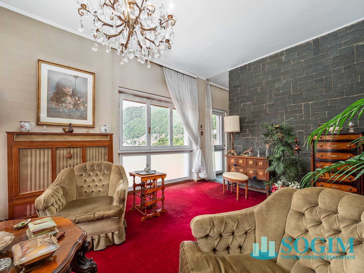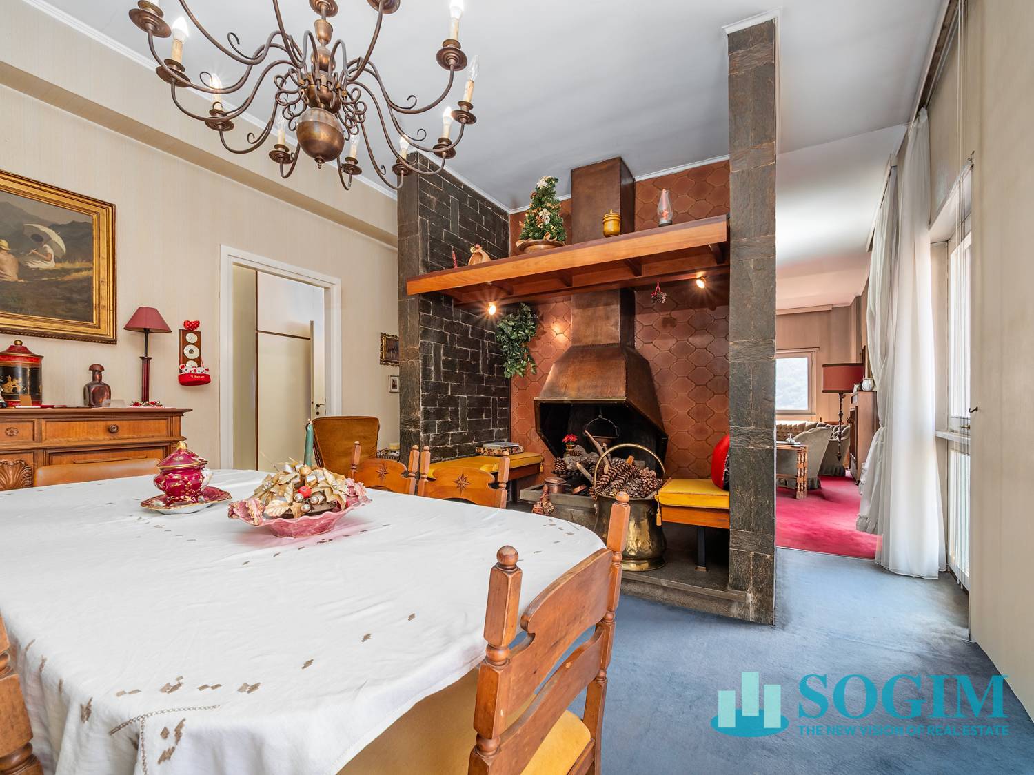 La zona giorno si apre su un ampio salone doppio con camino, ideale per momenti di relax e convivialit, arricchito da una piacevole vista sulla citt di Como e su Brunate.