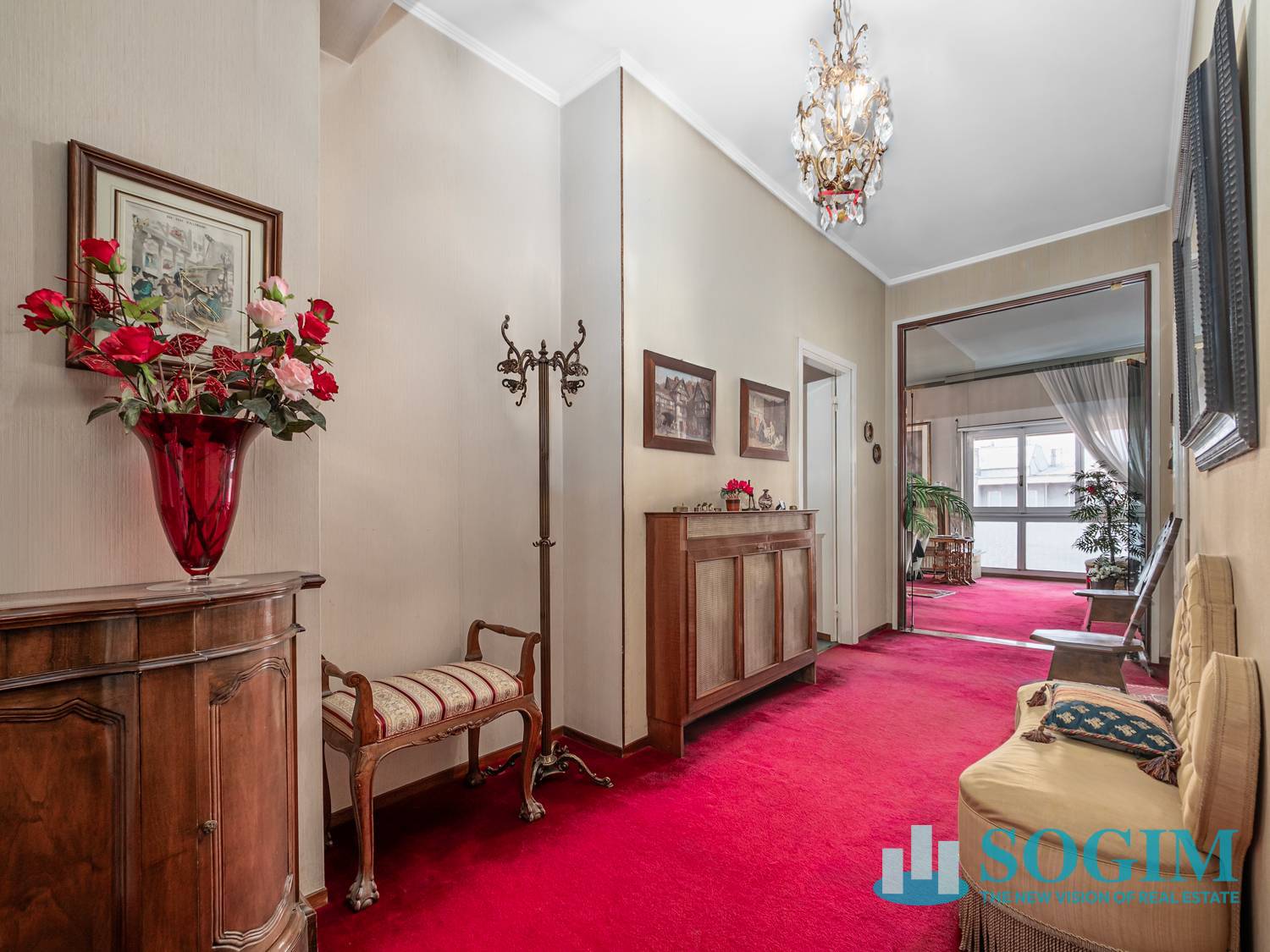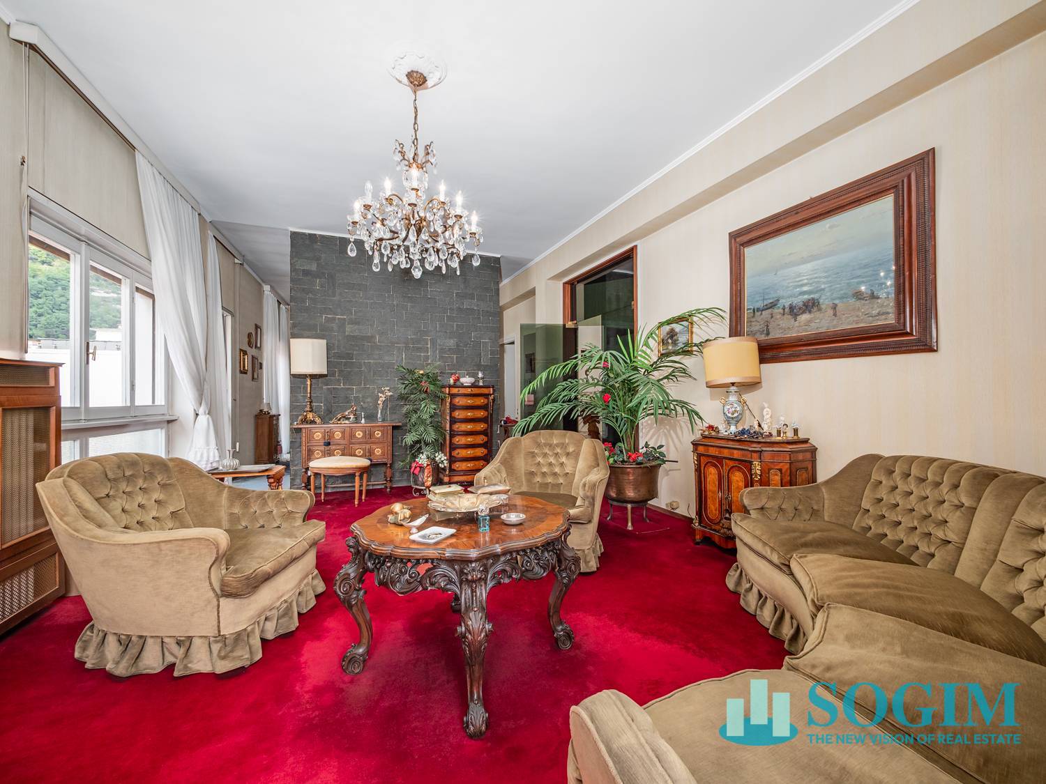 Limmobile presenta finiture dellepoca: porte a battente, infissi in legno con vetro singolo, pavimentazioni differenziate a seconda degli ambienti, dalla moquette nella zona giorno, alle piastrelle in cucina e bagni, parquet nelle camere.