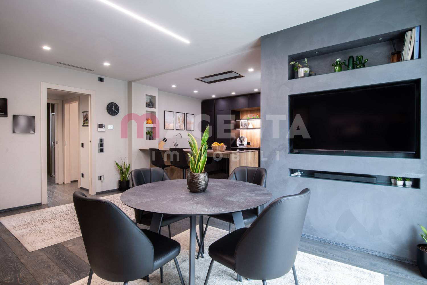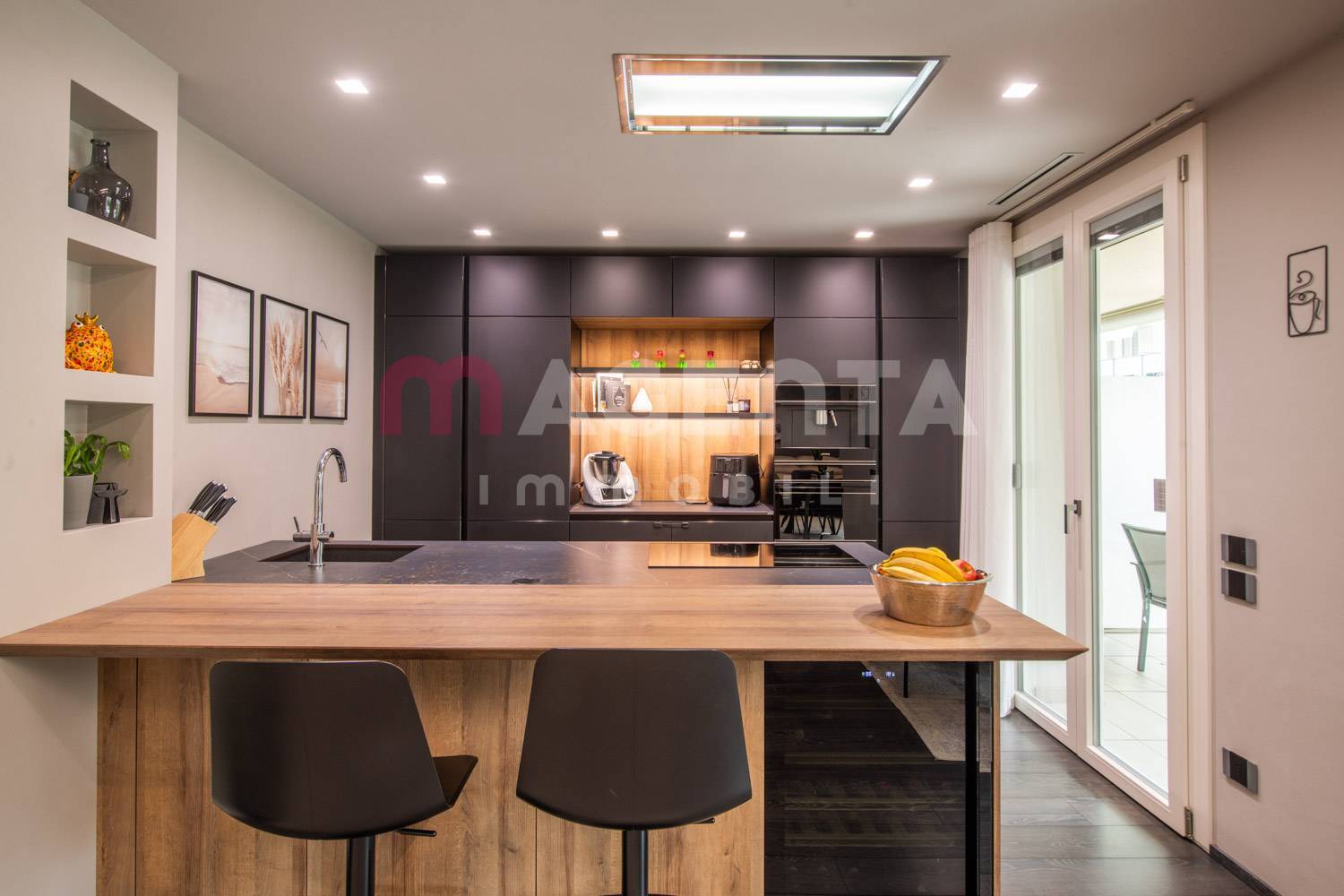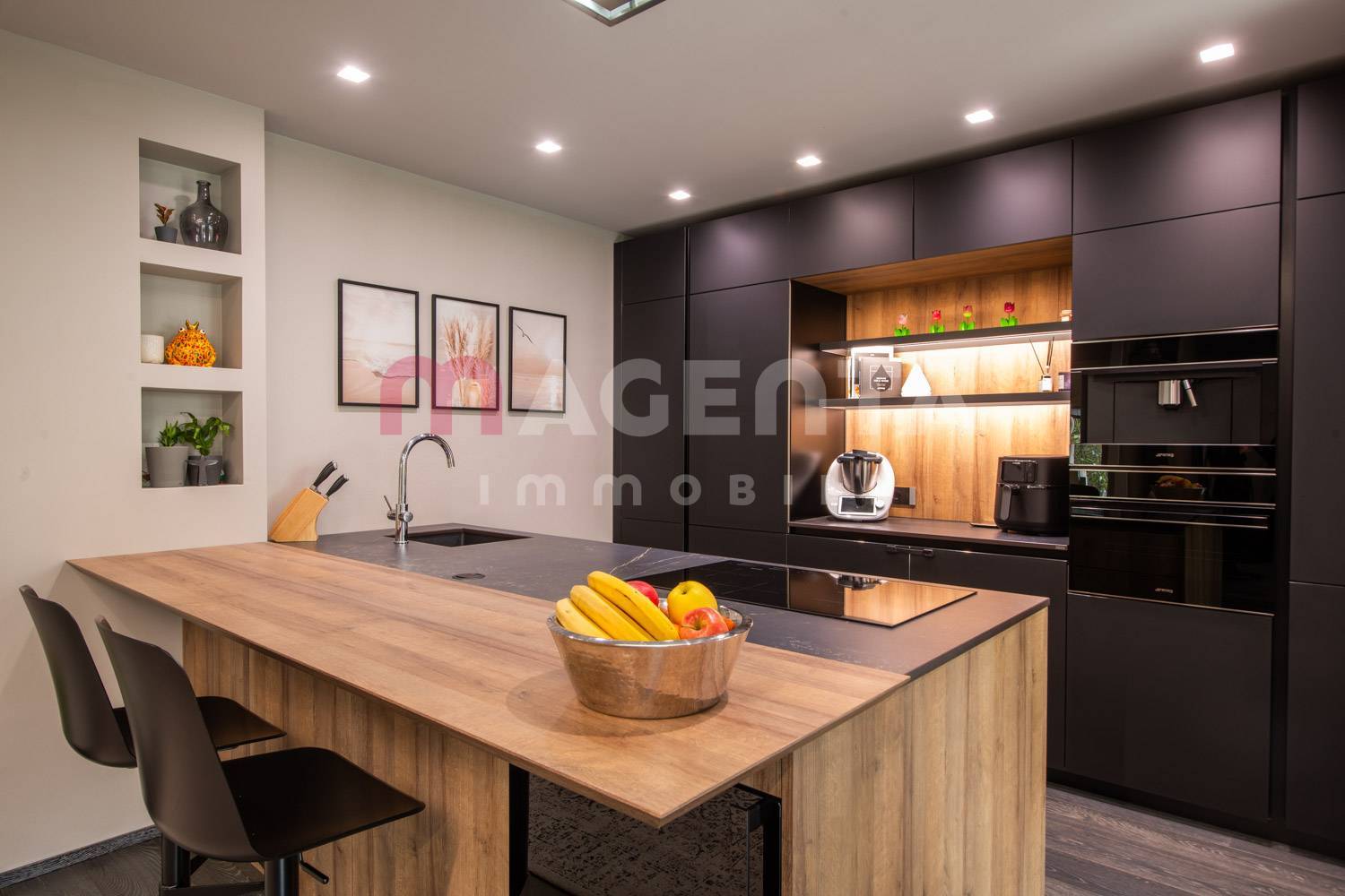 Entriamo in casa allinterno della zona giorno, percepiamo subito una zona conversazione/tv, una zona pranzo ed una stupenda cucina su misura con isola centrale.