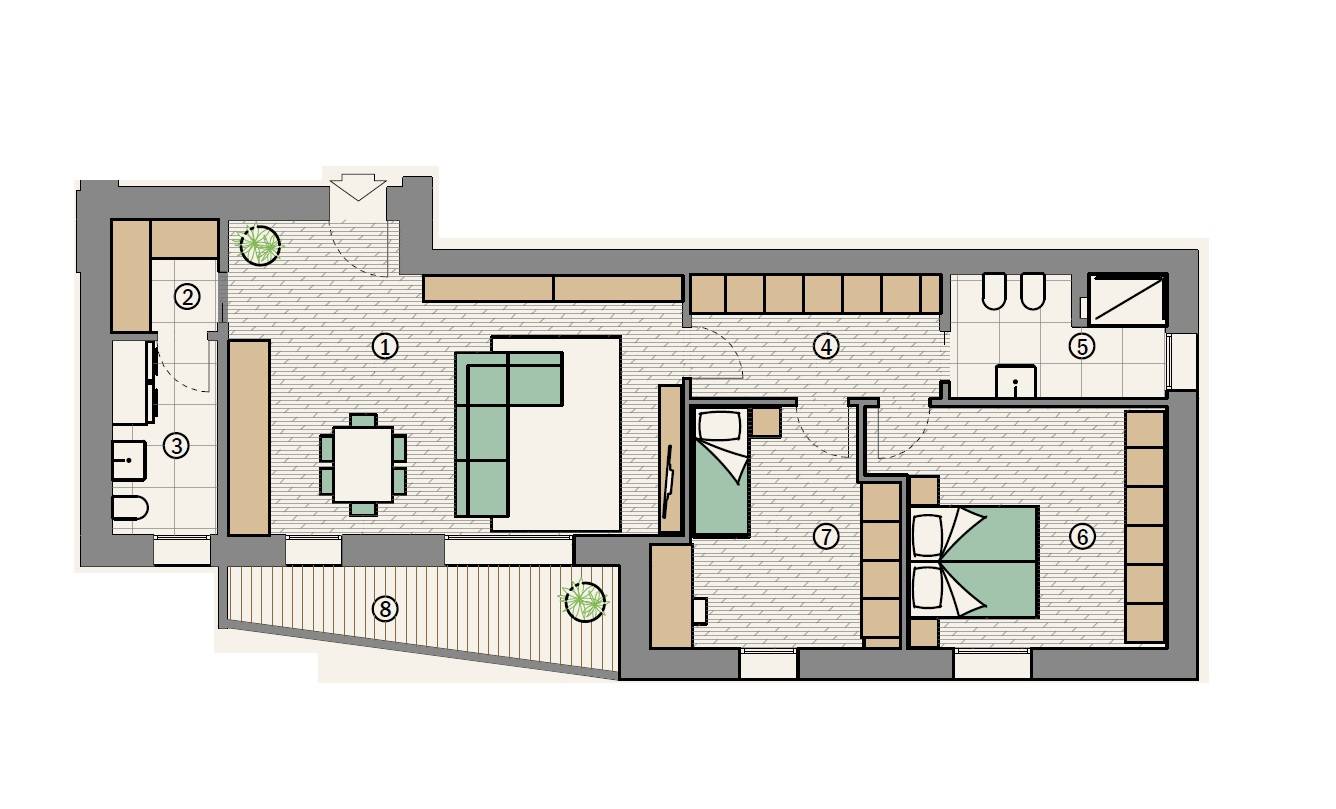 Composto da ingresso su luminosa zona giorno con angolo cottura e terrazza, disimpegno attrezzabile con armadiature, camera matrimoniale, camera singola, due bagni finestrati di cui uno con vano ripostiglio e lavanderia.