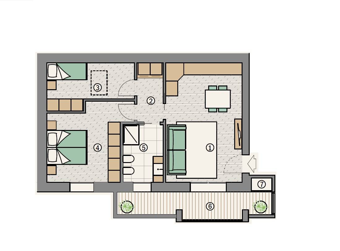 Composto da ingresso su zona giorno con angolo cottura e terrazza con vano tecnico, disimpegno attrezzabile, camera matrimoniale, camera singola, bagno.