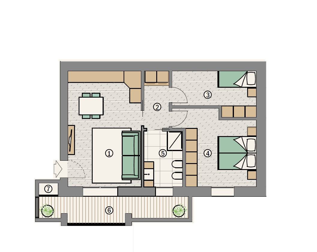 Composto da ingresso su zona giorno con angolo cottura e terrazza con vano tecnico, disimpegno attrezzabile, camera matrimoniale, camera singola, bagno.