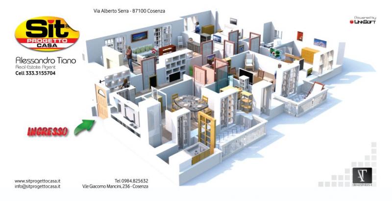 cosenza- via alberto serra ***.*******.** al piano sesto, cos composto: ingresso, salone doppio, cucina - tinello con annessa lavanderia, tre camere da letto matrimoniali, due bagni, tre balconi.