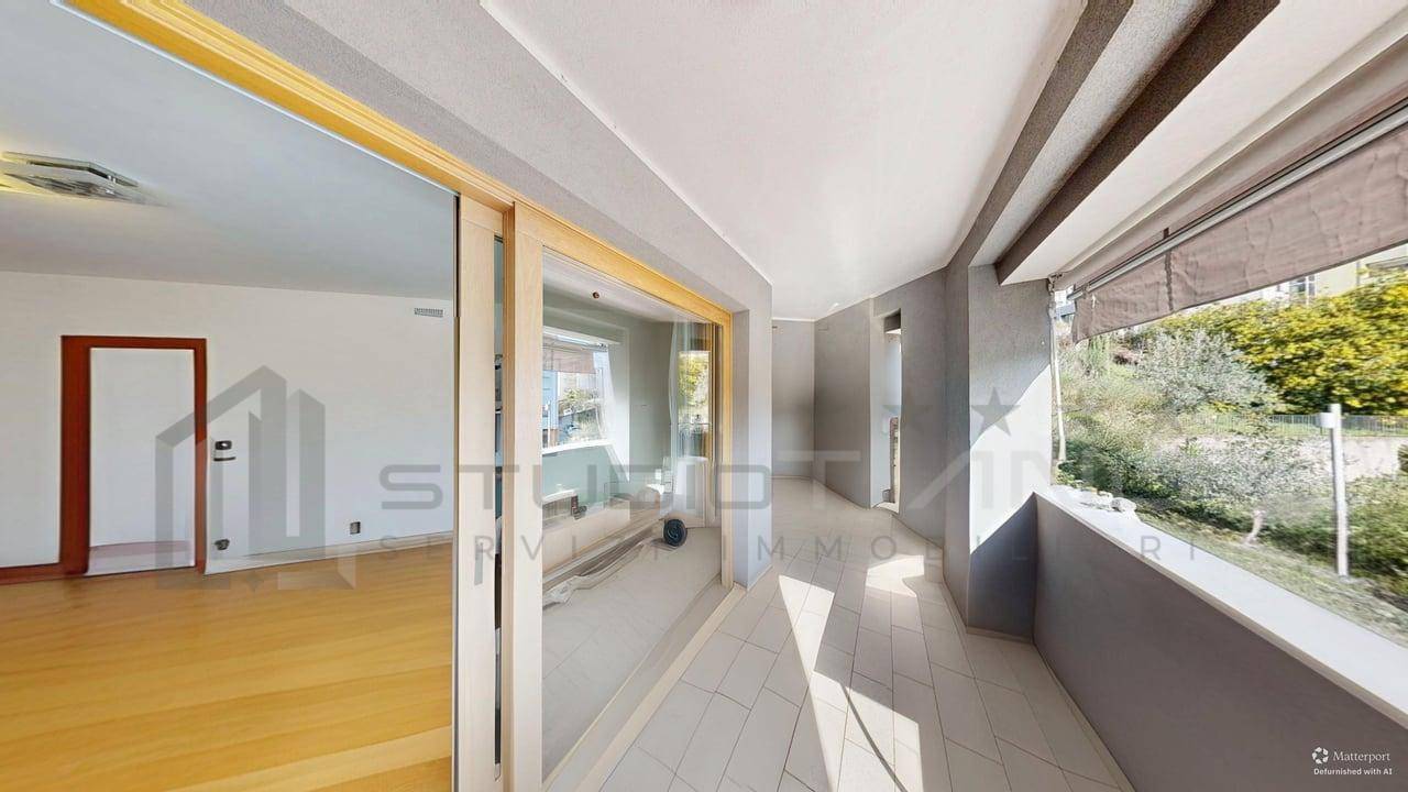 Limmobile si apre su unampia e luminosa zona living con grande vetrata e accesso a terrazzo coperto di 16 mq, ideale per momenti di relax.