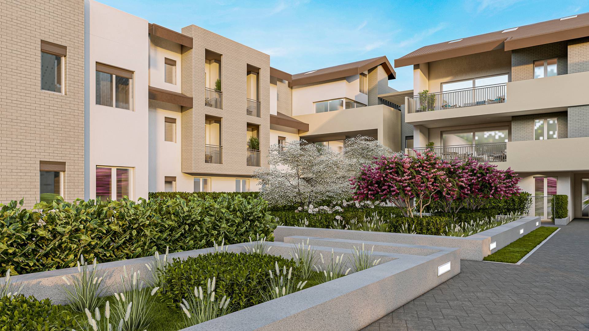Il progetto richiama la tradizione, con la sua corte aperta che accoglie 42 appartamenti tra duplex, trilocali e quadrilocali con giardini o terrazzi oltre a spazi verdi comuni dove vivere allaperto con la famiglia in tutta sicurezza.