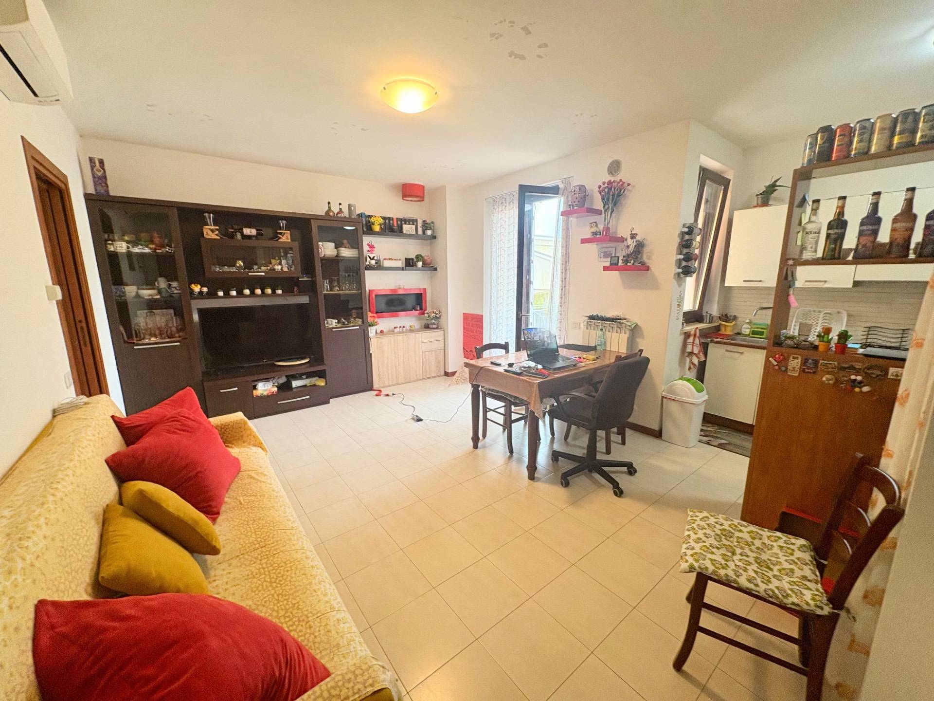 Labitazione composta da luminoso soggiorno con angolo cottura e accesso al terrazzo, due camere matrimoniali, di cui una con uscita su balconcino, e bagno finestrato completo di doccia.