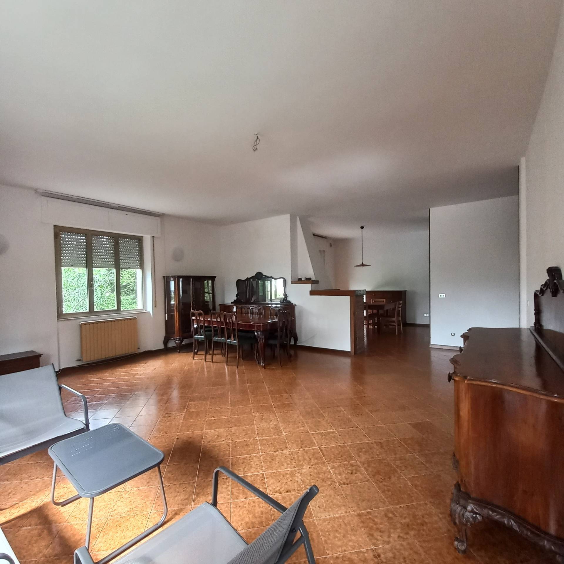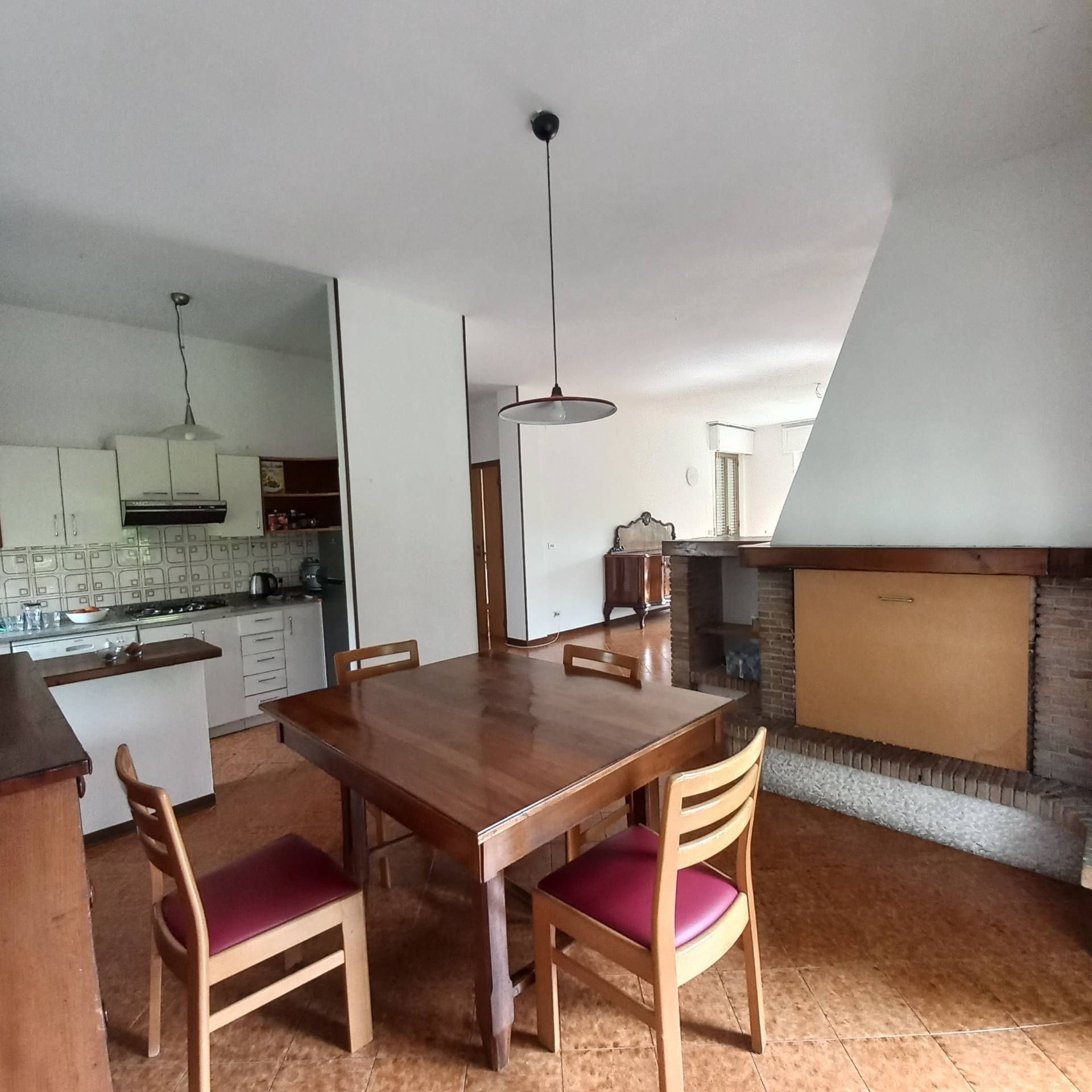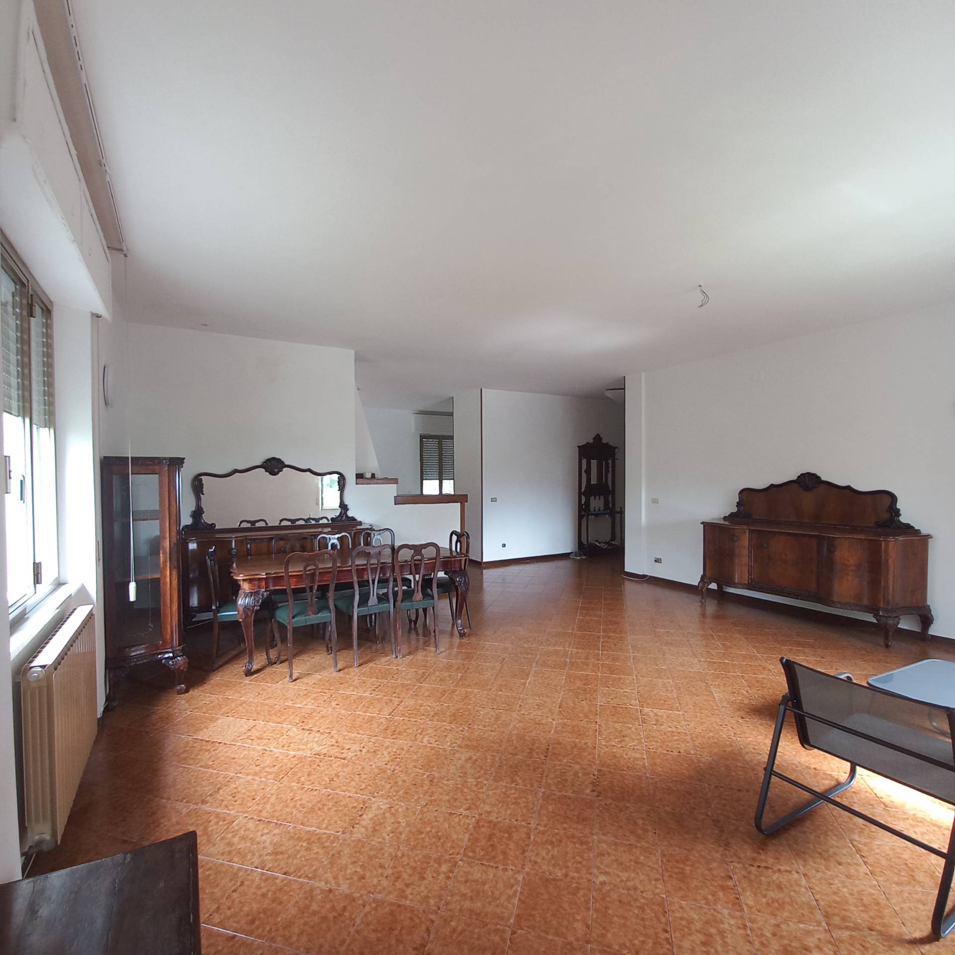 L'appartamento composto da il piano primo con una enorme zona giorno con salone e zona pranzo aperta, camino centrale, angolo cottura e balconi perimetrali, la zona notte composta da quattro ampie camere da letto e due bagni finestrati, su questo piano i pavimenti sono in ceramica nella zona giorno e parquette nelle camere, gli infissi sono in alluminio con scorrevoli in pvc. Il secondo piano composto da mansarda con il classico tetto spiovente rivestito in legno, pavimenti in moquette, camino nella zona giorno, tinello, bagno, camera matrimoniale e studio, a tutti gli effetti un piccolo appartamentino di 60 mq, pi 122 mq di sottotetto.