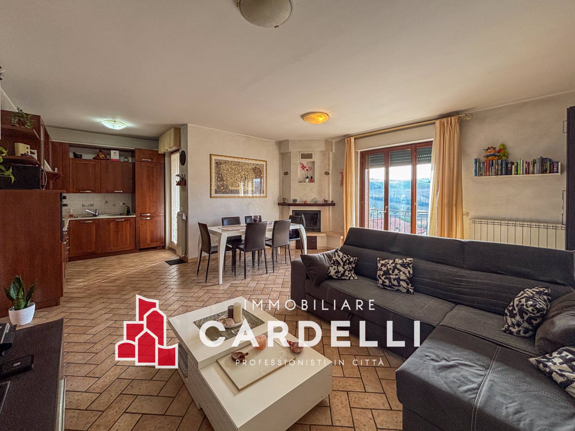 Lingresso si apre su un ampio soggiorno con angolo cottura, impreziosito da un camino e da due porte-finestre che garantiscono unottima illuminazione naturale e consentono laccesso diretto al terrazzo.