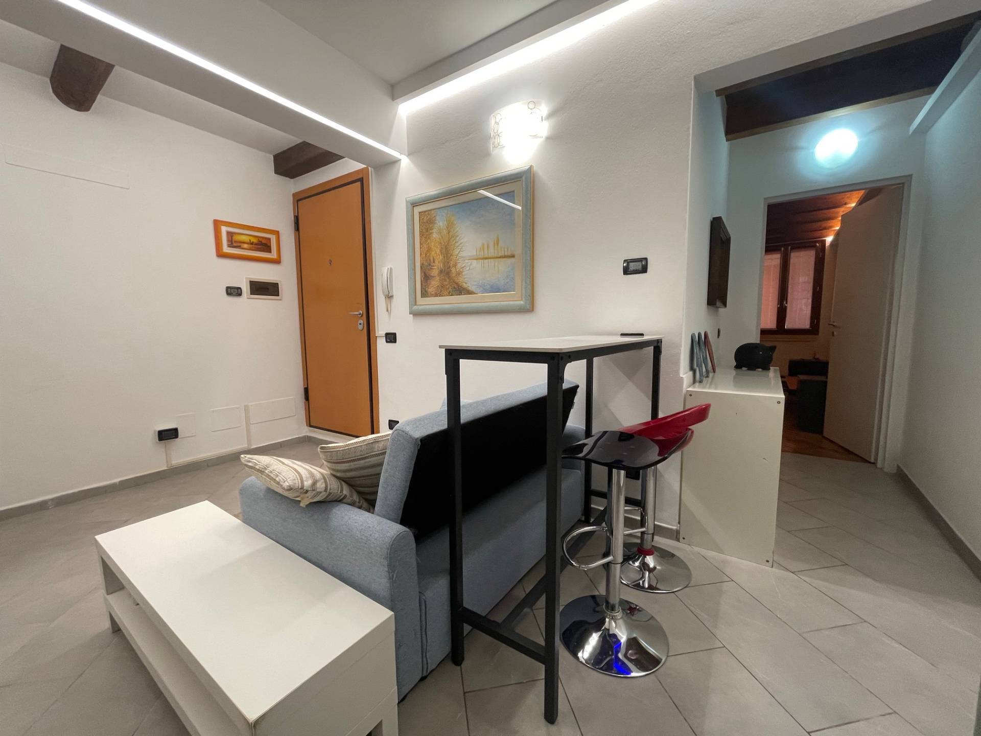 Ingresso su soggiorno con angolo cottura, porta finestra che fa accedere ad un piccolo giardino interno riservato completamente pavimentato, dotato di attacchi acqua.