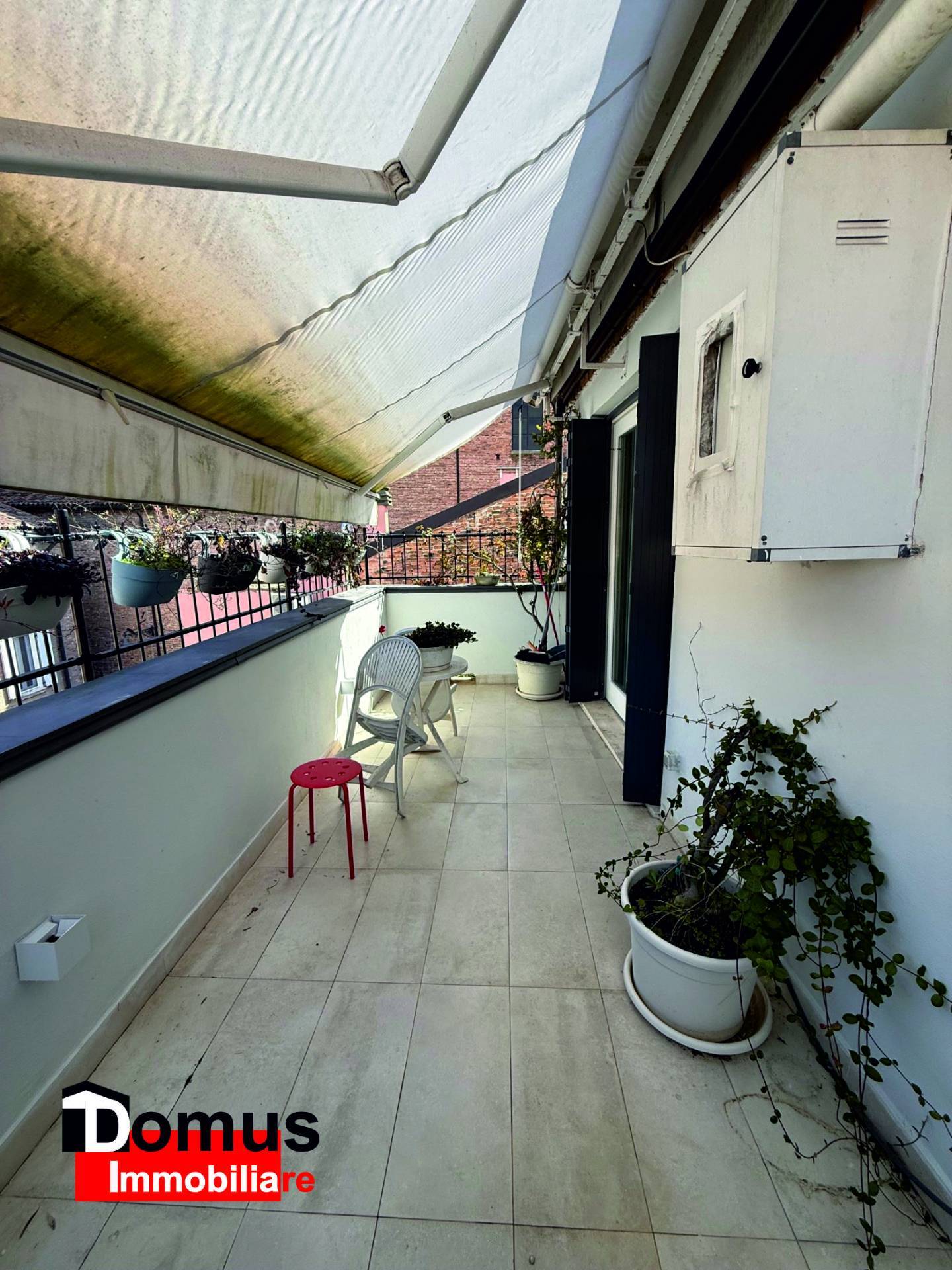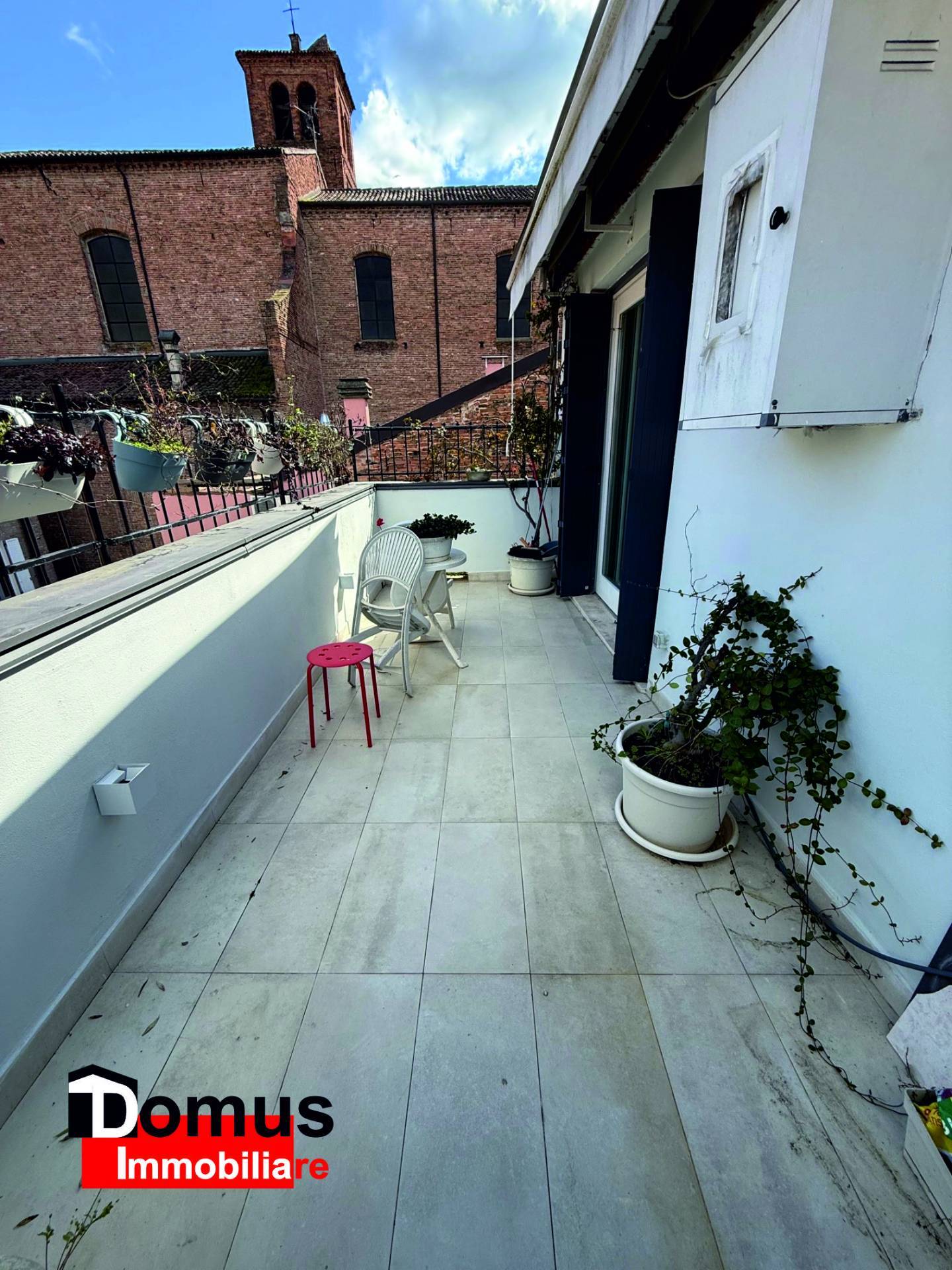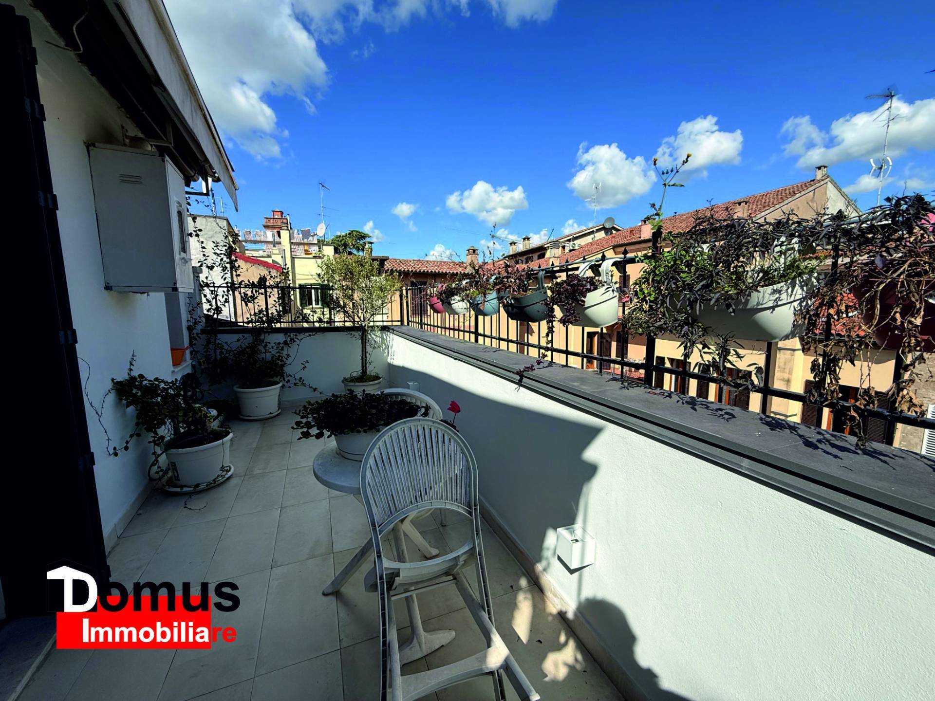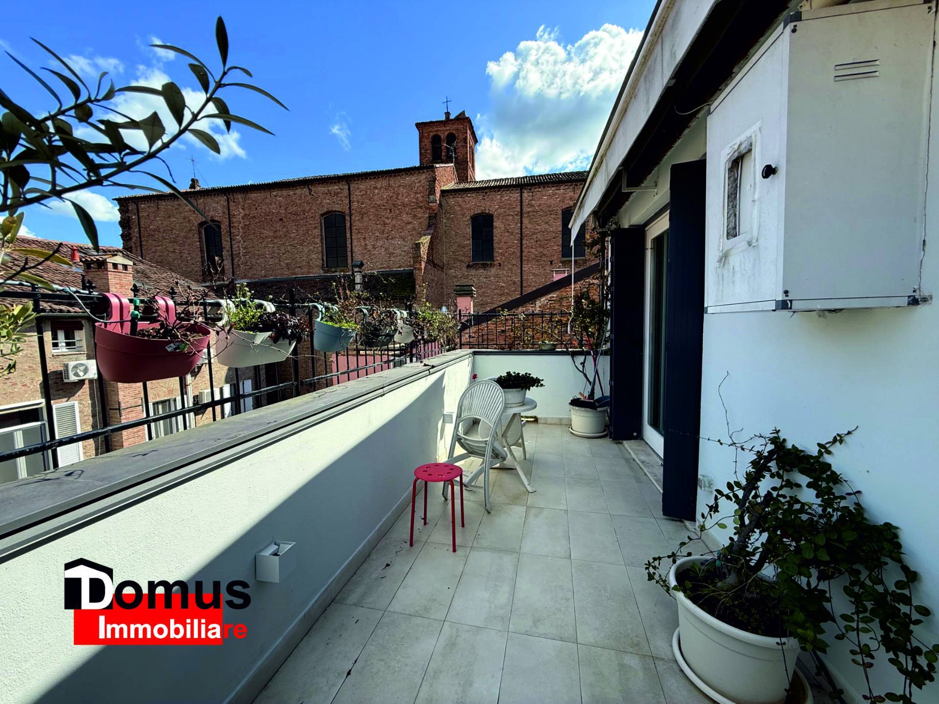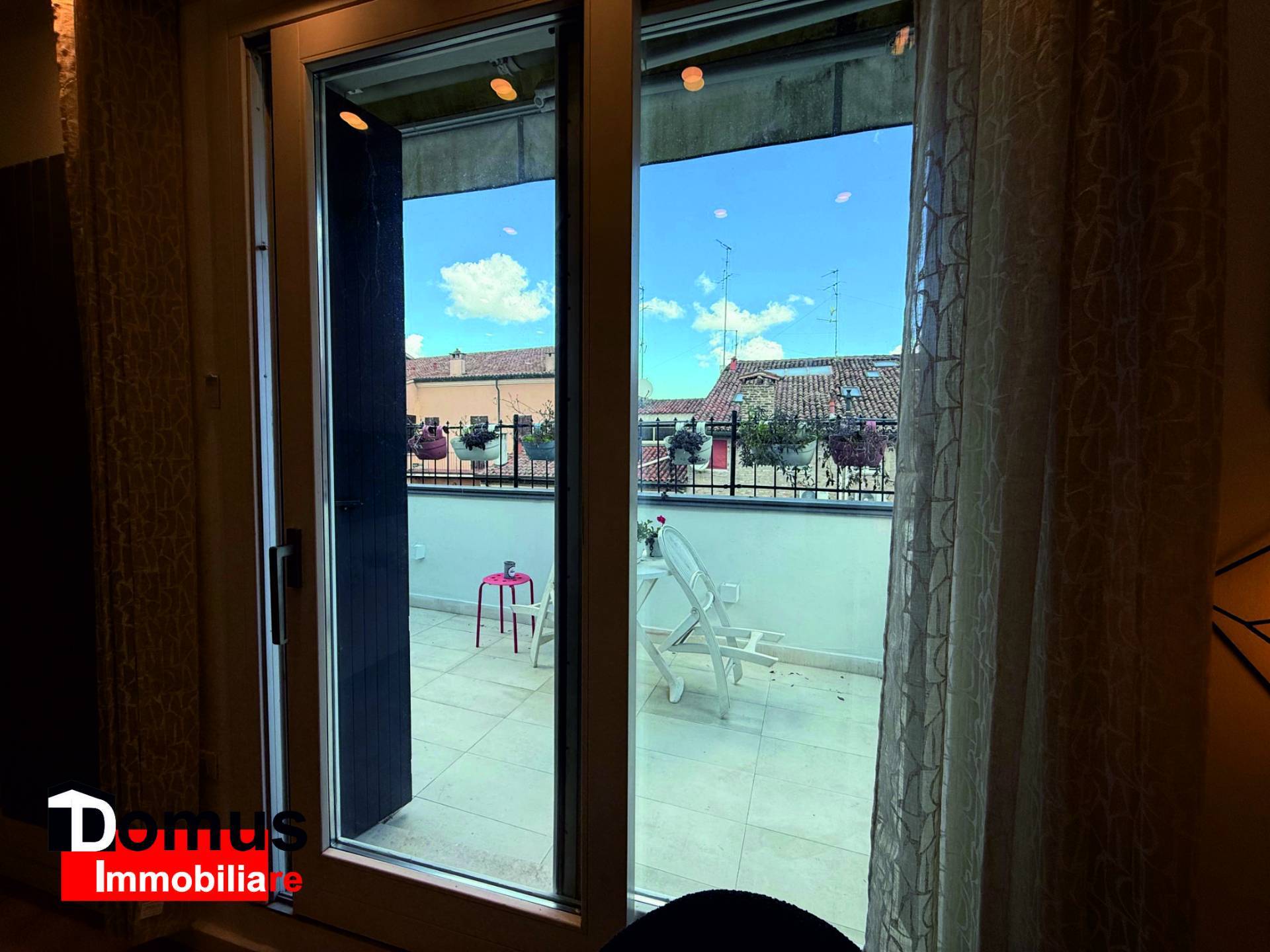L'immobile costituito da ampio ingresso, soggiorno con affaccio su terrazza con vista spettacolare sui tetti della Ferrara antica, cucina abitabile, camera matrimoniale, camera singola (o studio), bagno finestrato, ampi ripostigli in zona sottotetto.