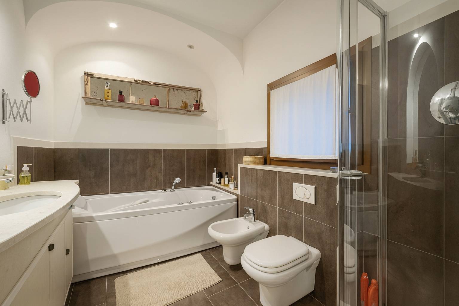 La zona notte composta da una camera da letto matrimoniale e un bagno elegante finestrato con vasca idromassaggio e doccia angolare, oltre ad un antibagno/lavanderia finestrato.