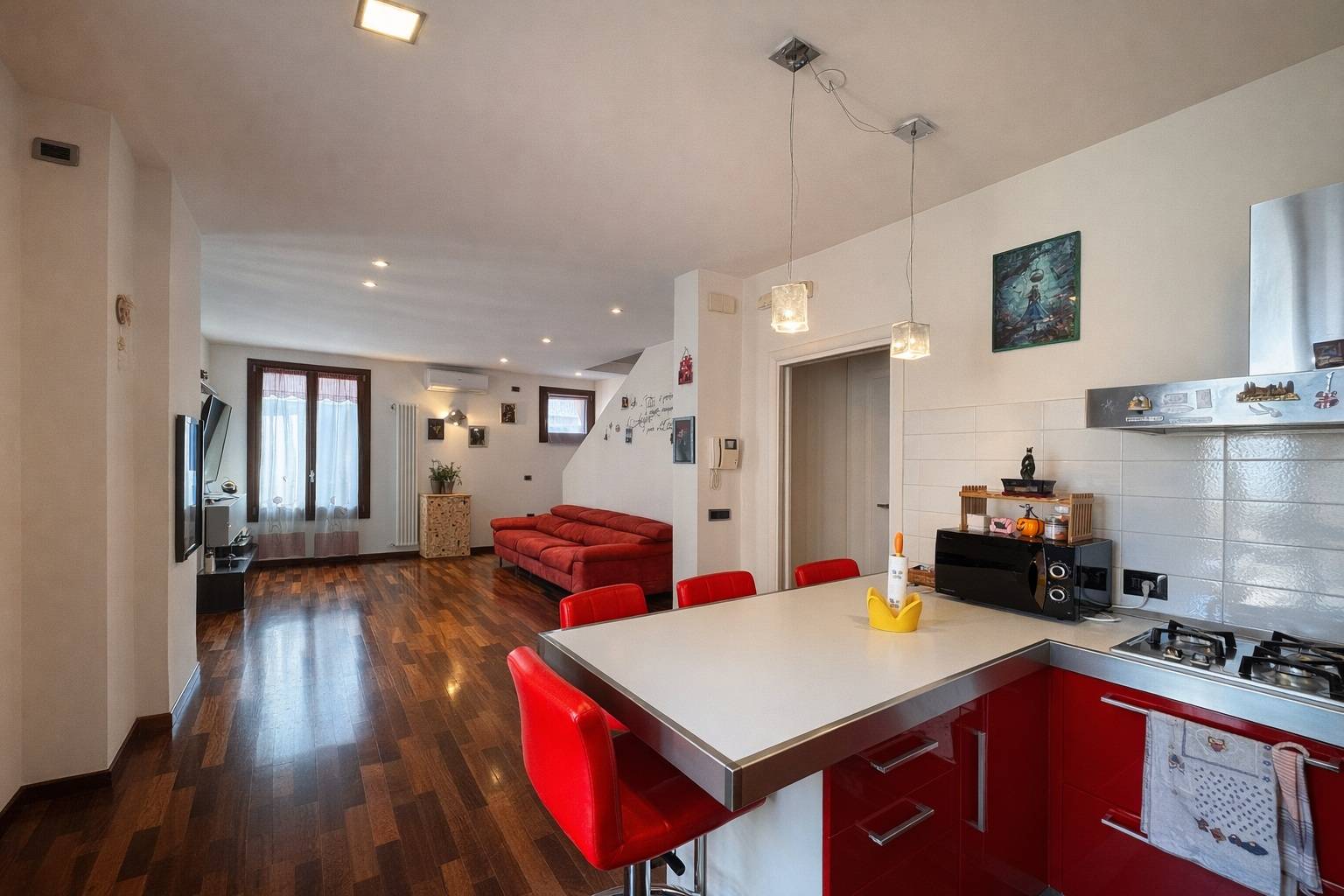 Al piano terra: ingresso con vano ripostiglio, scala di accesso al piano primo composto di: ampia zona giorno openspace con zona living e cucina con penisola, terrazza con pergola di circa 20 mq, disimpegno con zona lavanderia, e bagno con doccia.