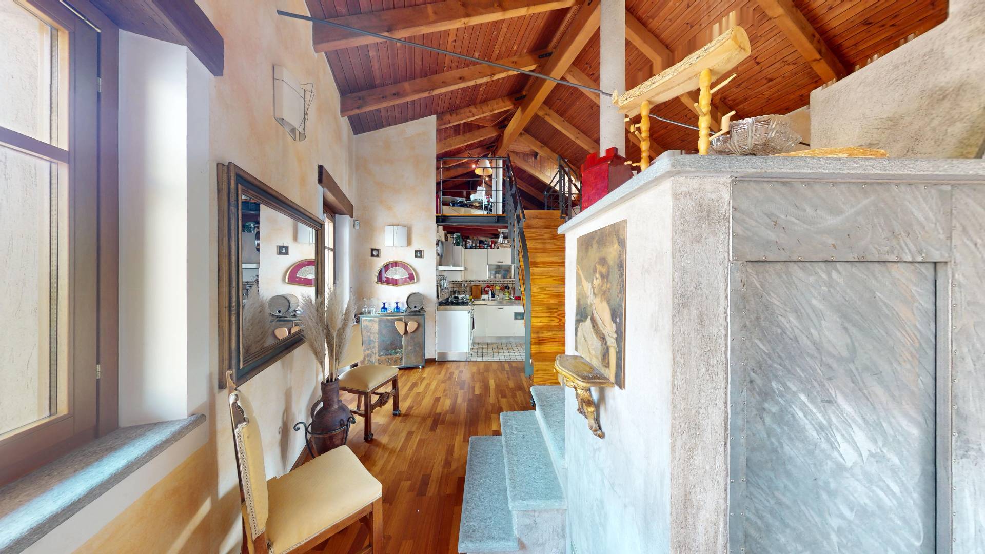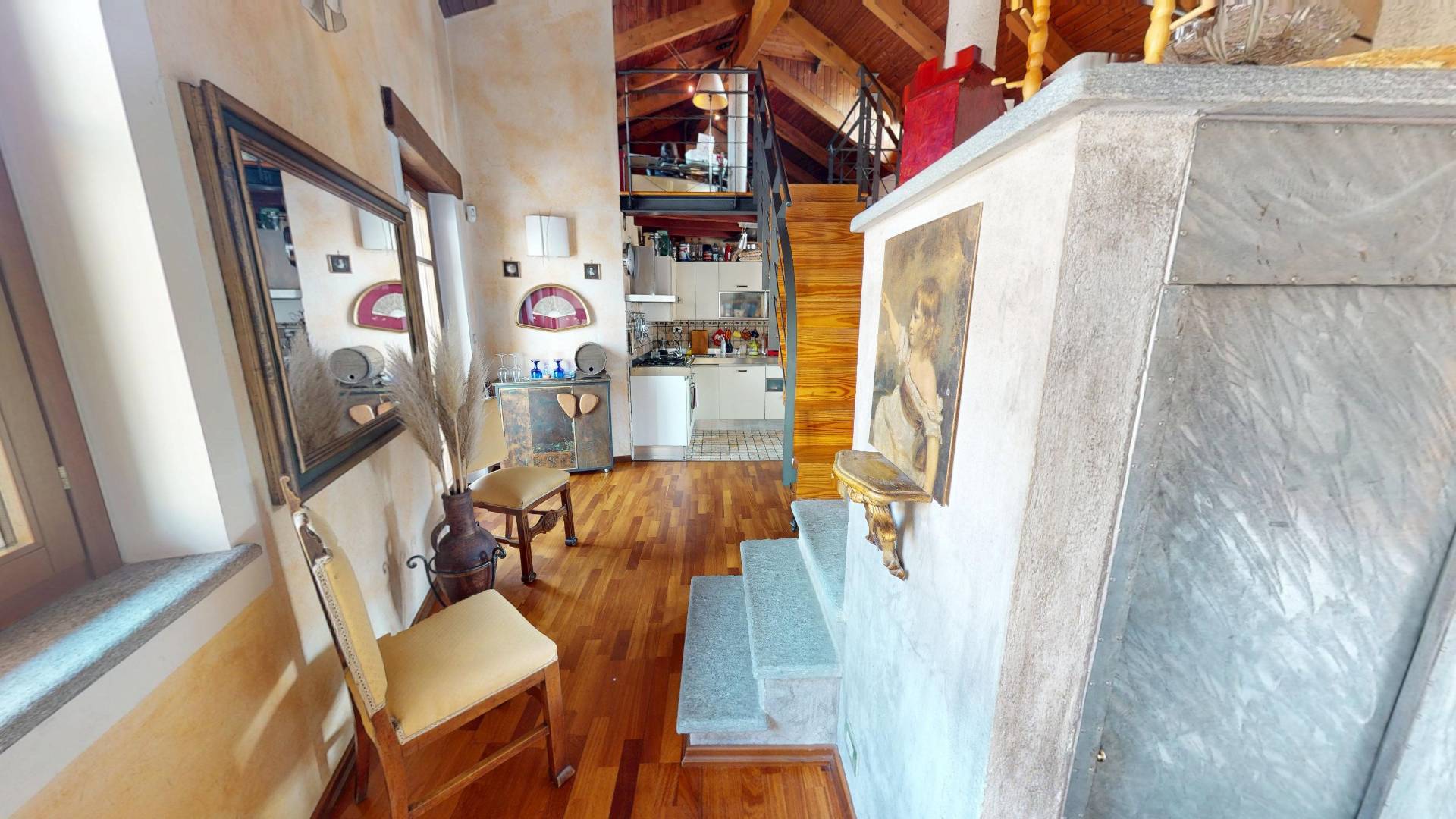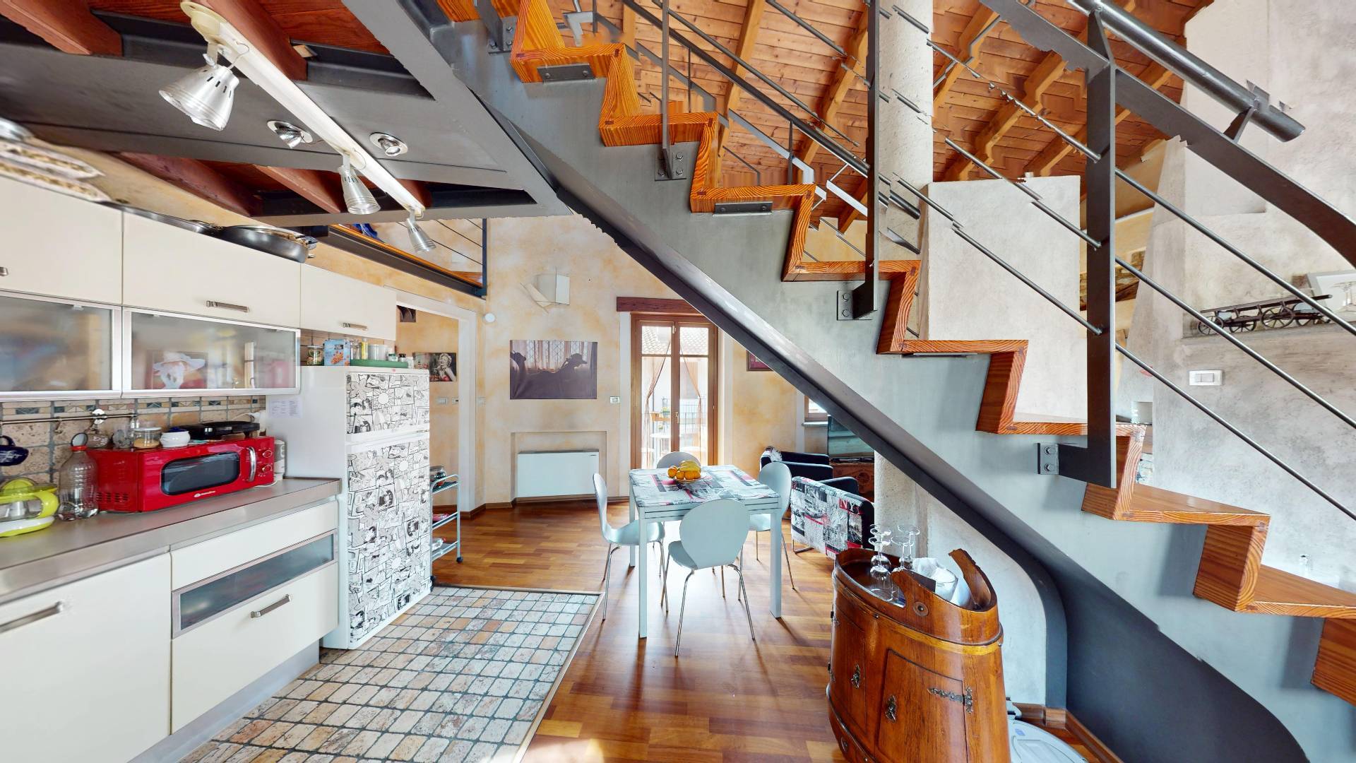 Dal soggiorno, tramite meravigliosa scala di design, possibile accedere alla zona soppalco mansardata composta da due locali distinti, il primo attualmente adibito a studio ed il secondo come locale di sgombero.