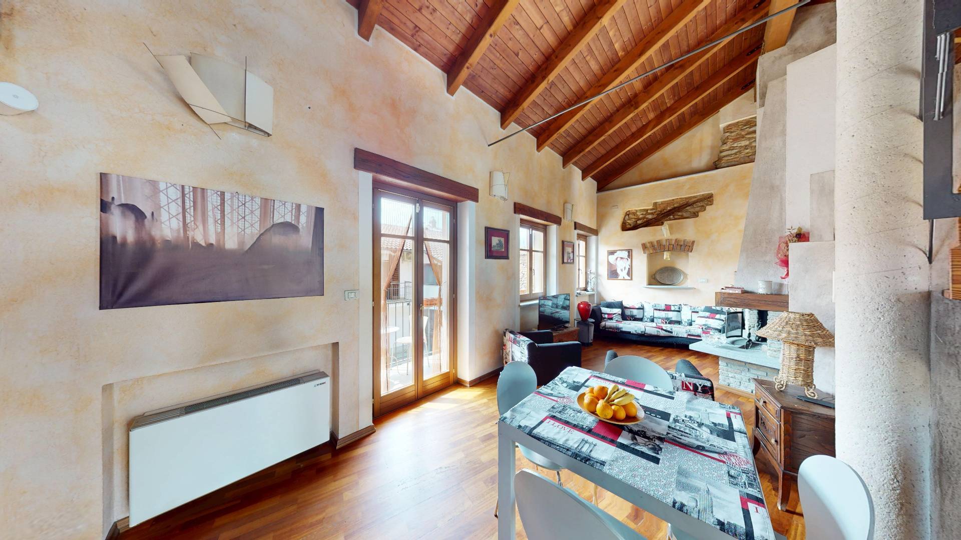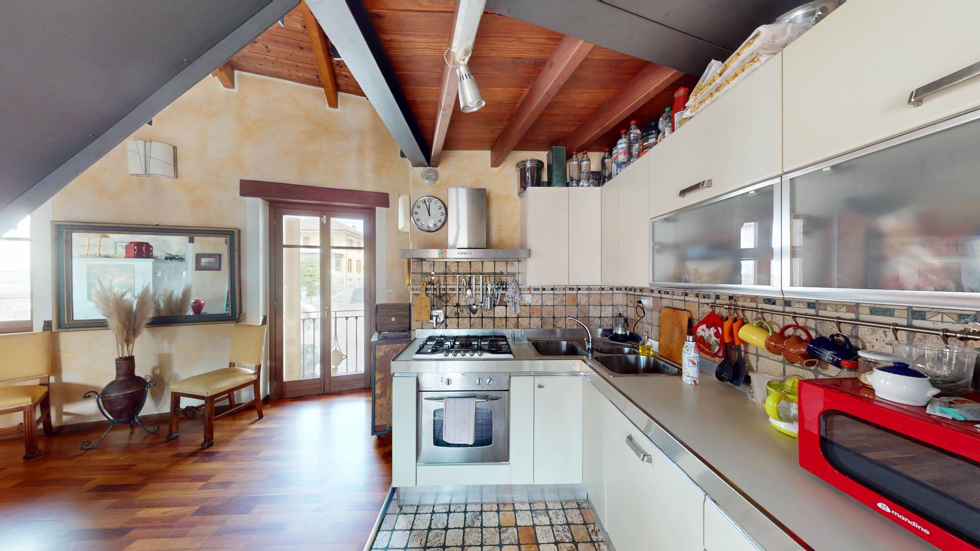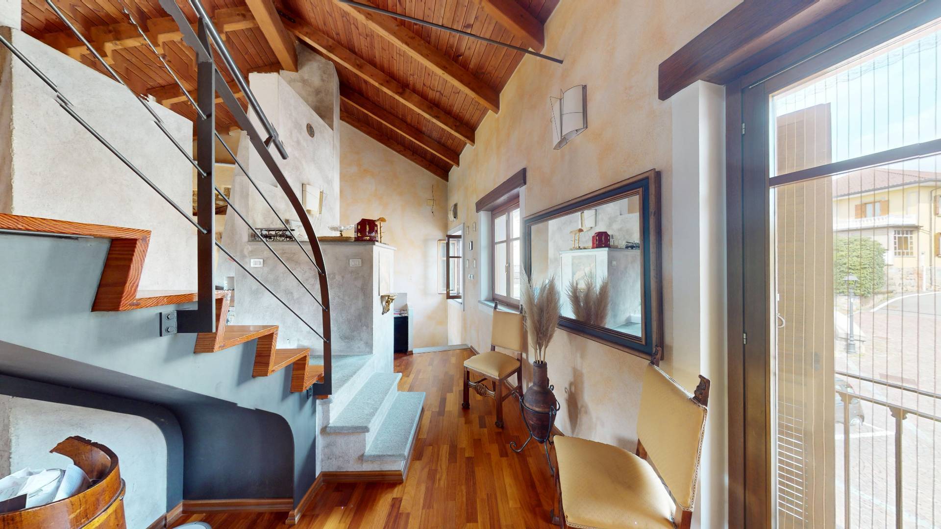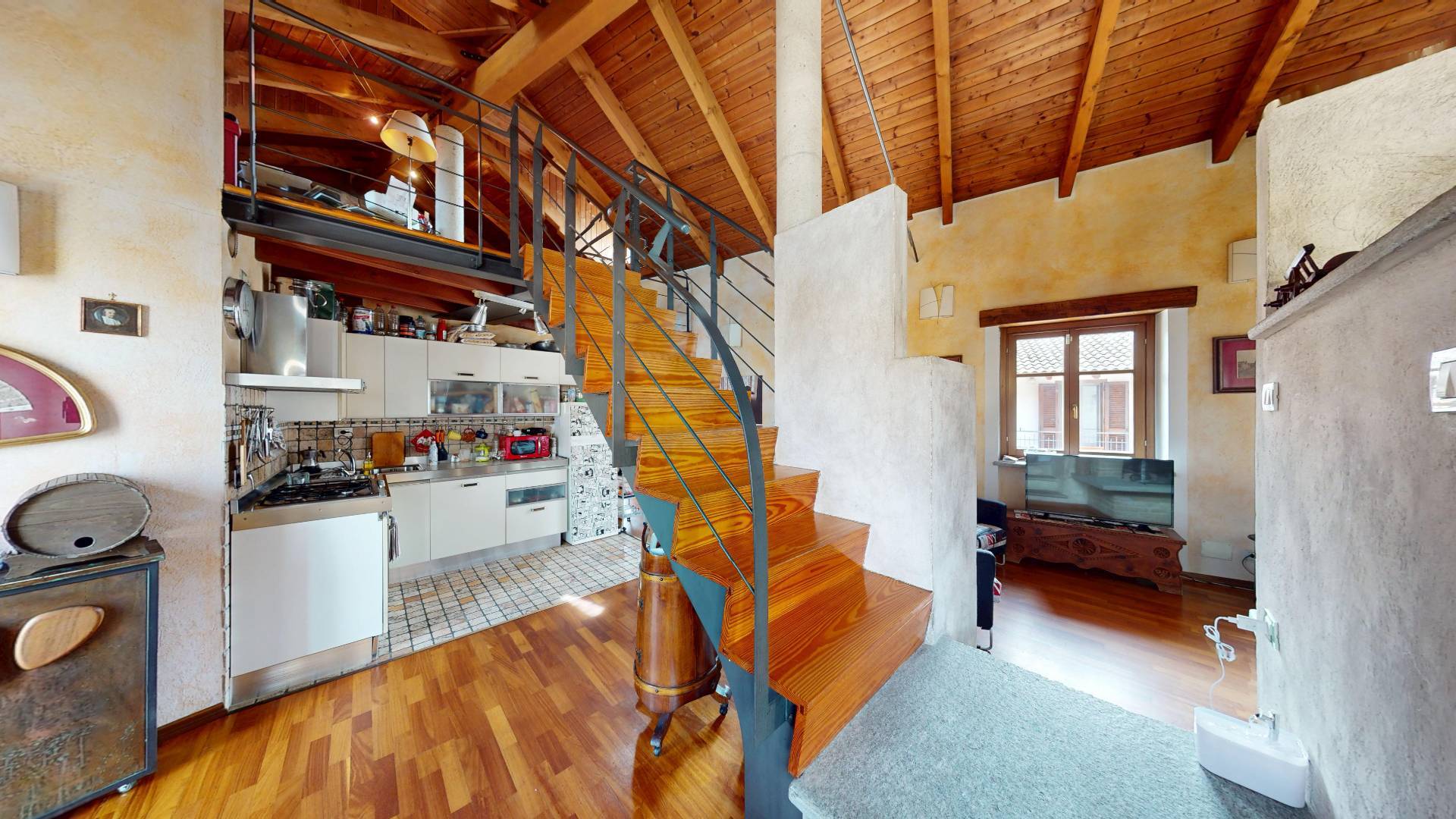 Dal soggiorno, tramite meravigliosa scala di design, possibile accedere alla zona soppalco mansardata composta da due locali distinti, il primo attualmente adibito a studio ed il secondo come locale di sgombero.