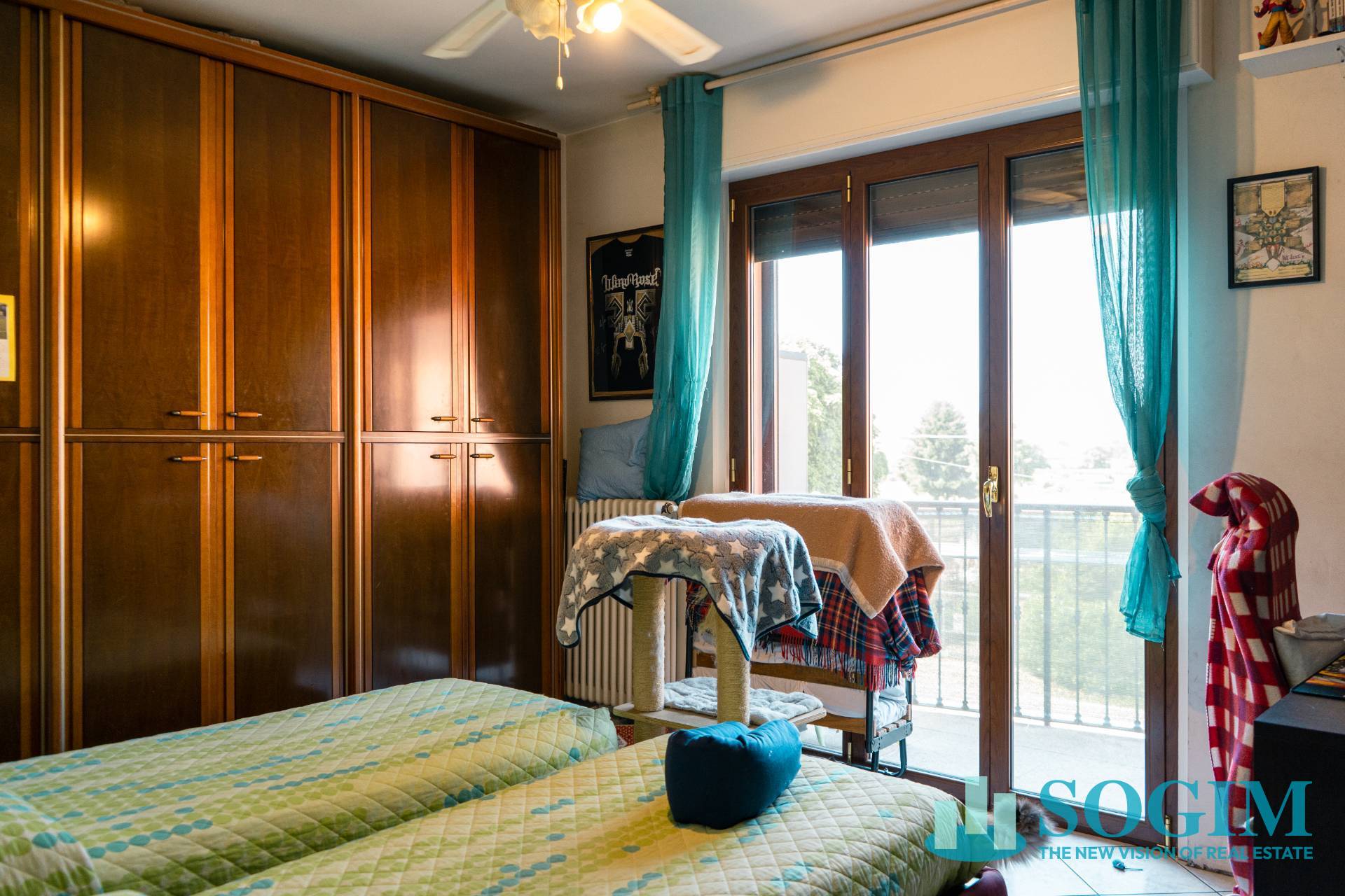 L'appartamento ha una doppia esposizione nord- ovest ed composto dall'ingresso che si apre sul soggiorno con cucina a vista, con accesso ad un ampio balcone; un piccolo disimpegno conduce alla zona notte costituita dalla prima camera da letto e dal bagno finestrato dotato di doccia.