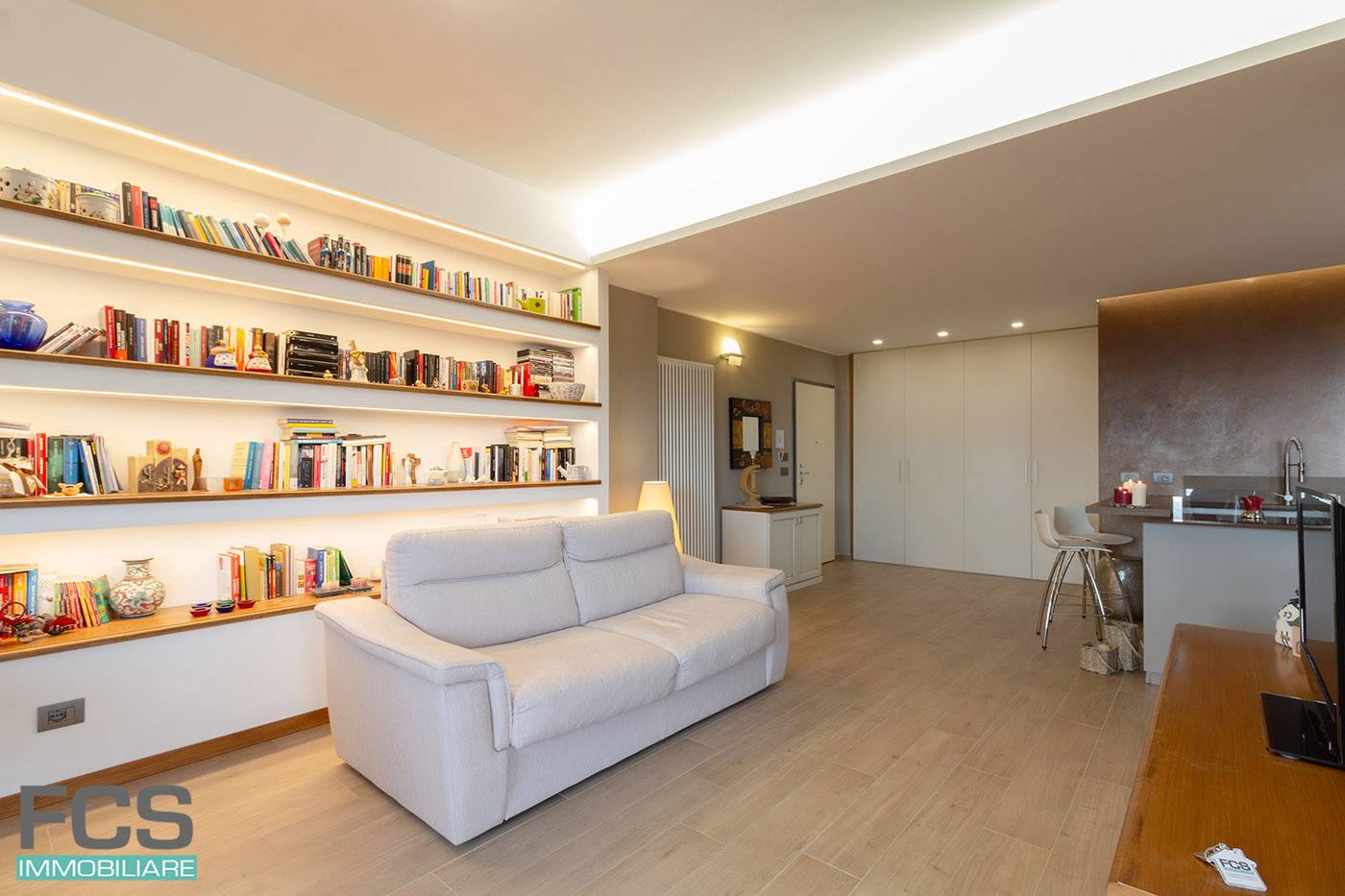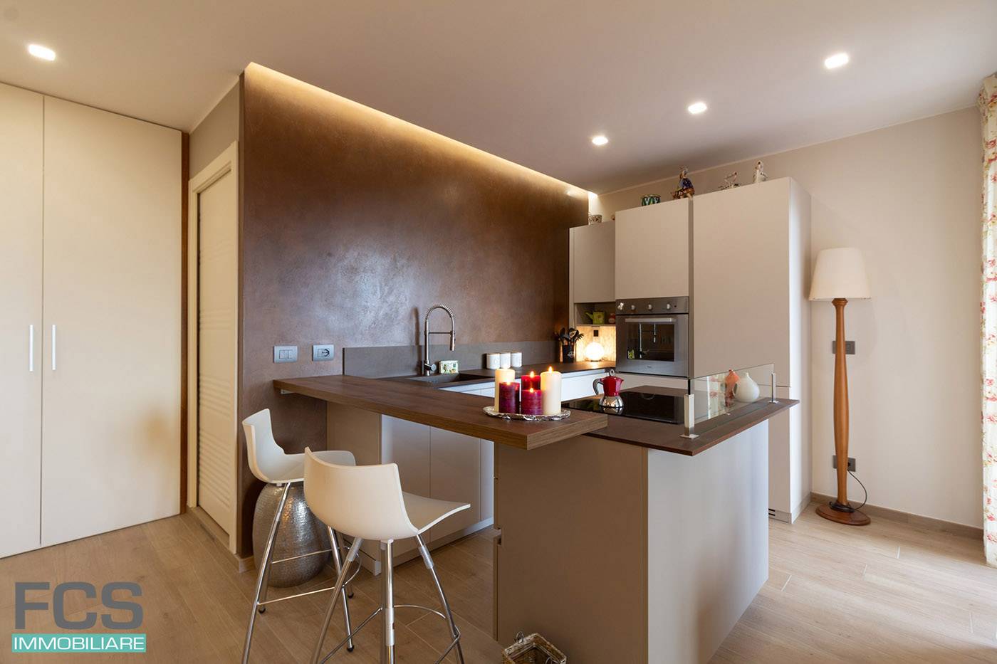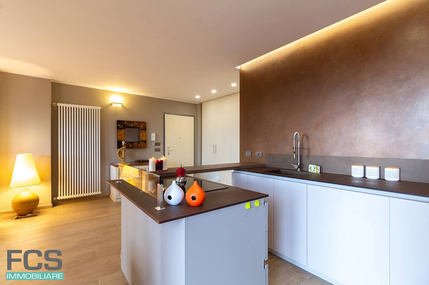 L'ambiente: la metratura si sviluppa con intelligenza in un ampio living open space, un continuum visivo dove convivono cucina di design, zona pranzo, salotto e armadiature integrate.