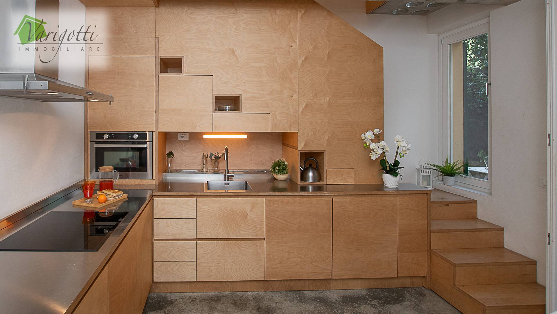 La cucina stata incastonata in un sistema in legno di betulla che diventa anche scala per accedere al piano superiore, dove si trova una spaziosa zona living, un'altra camera da letto e un bagno, oltre a un pratico ripostiglio.