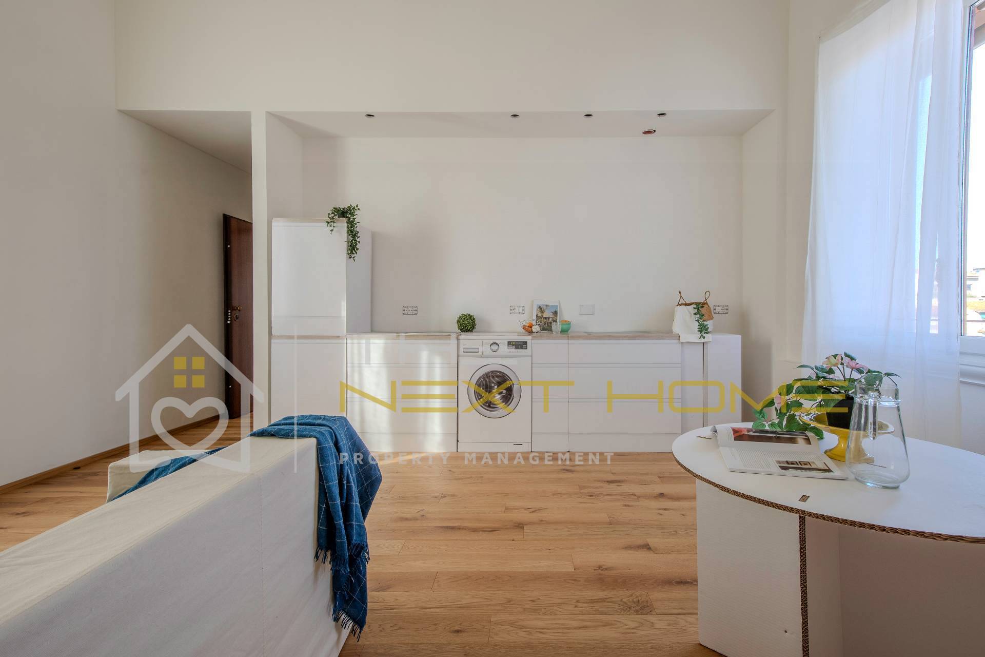 L'ingresso si apre su un ampio e luminoso SOGGIORNO, con AMPIA CUCINA A VISTA e dal quale si accede alla ZONA NOTTE composta da TRE CAMERE da letto di cui una matrimoniale e due singole, i DOPPI SERVI moderni ed eleganti ed infine un GRANDE BALCONE.