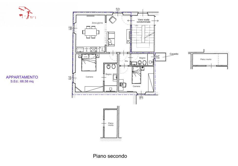 E' composto da soggiorno con angolo cottura, camera con bagno privato, altra camera, altro bagno e 2 palchi morti.