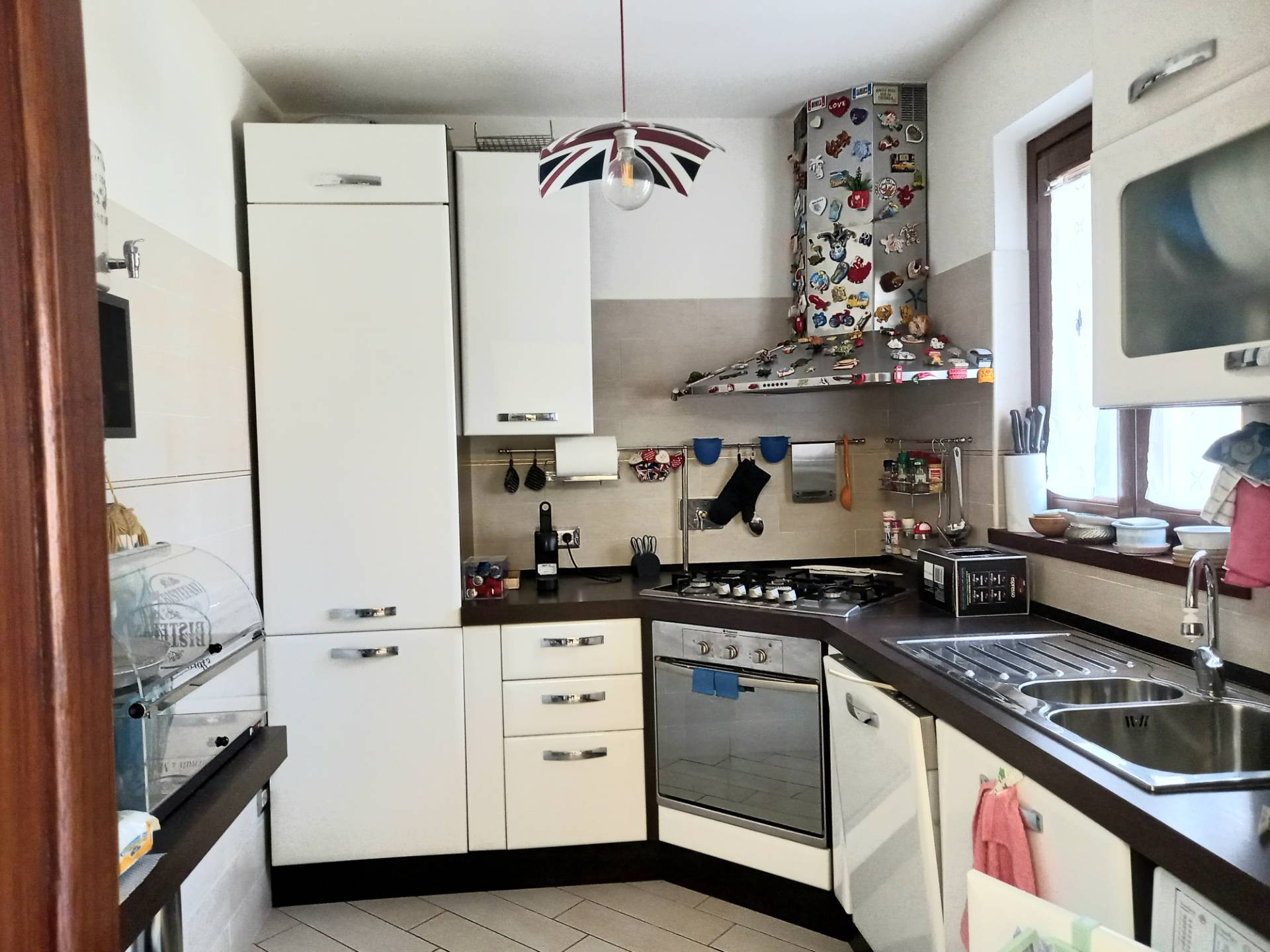 La cucina abitabile si affaccia su un grazioso terrazzo, ideale per godersi i momenti di relax all'aperto.