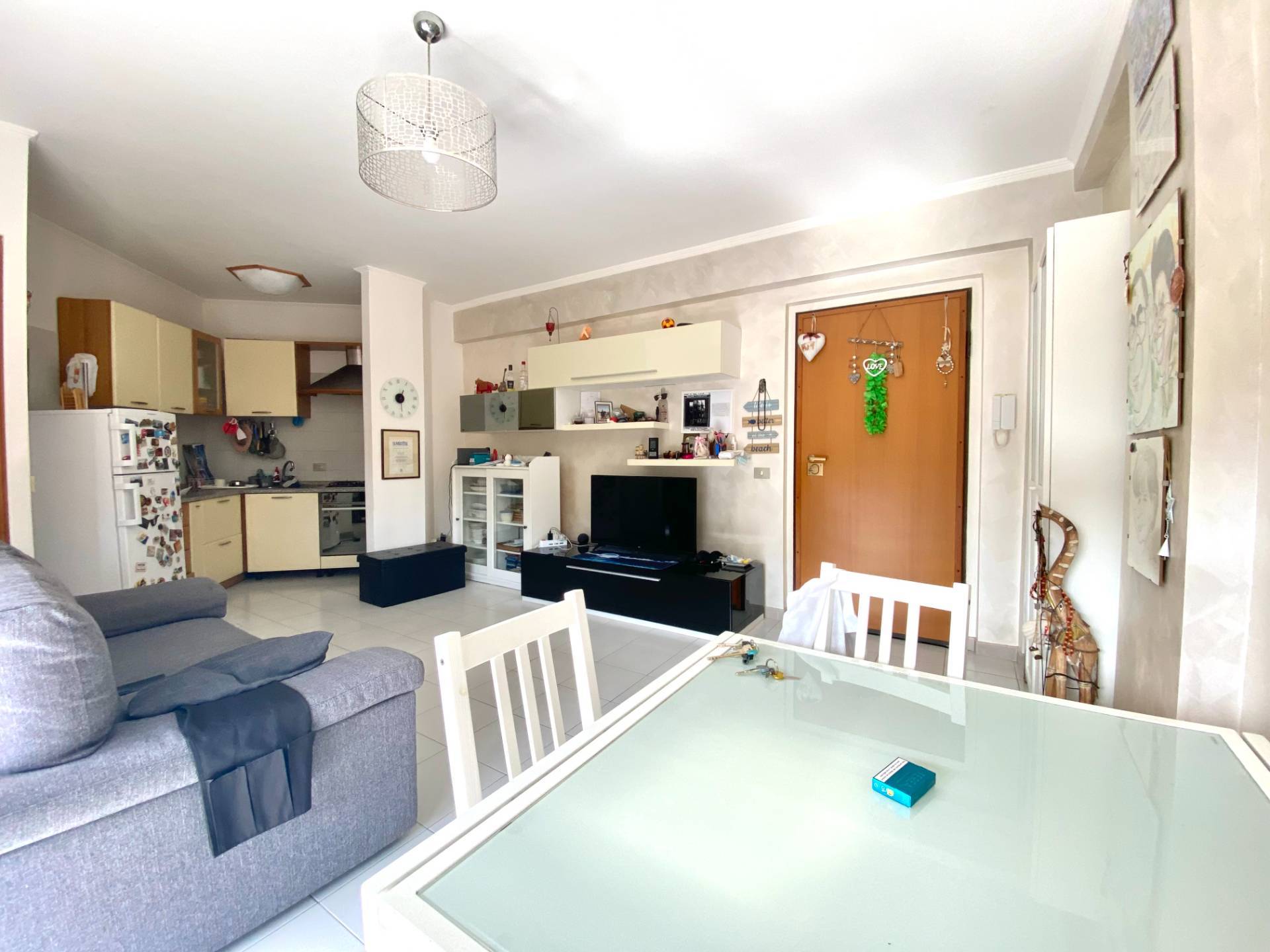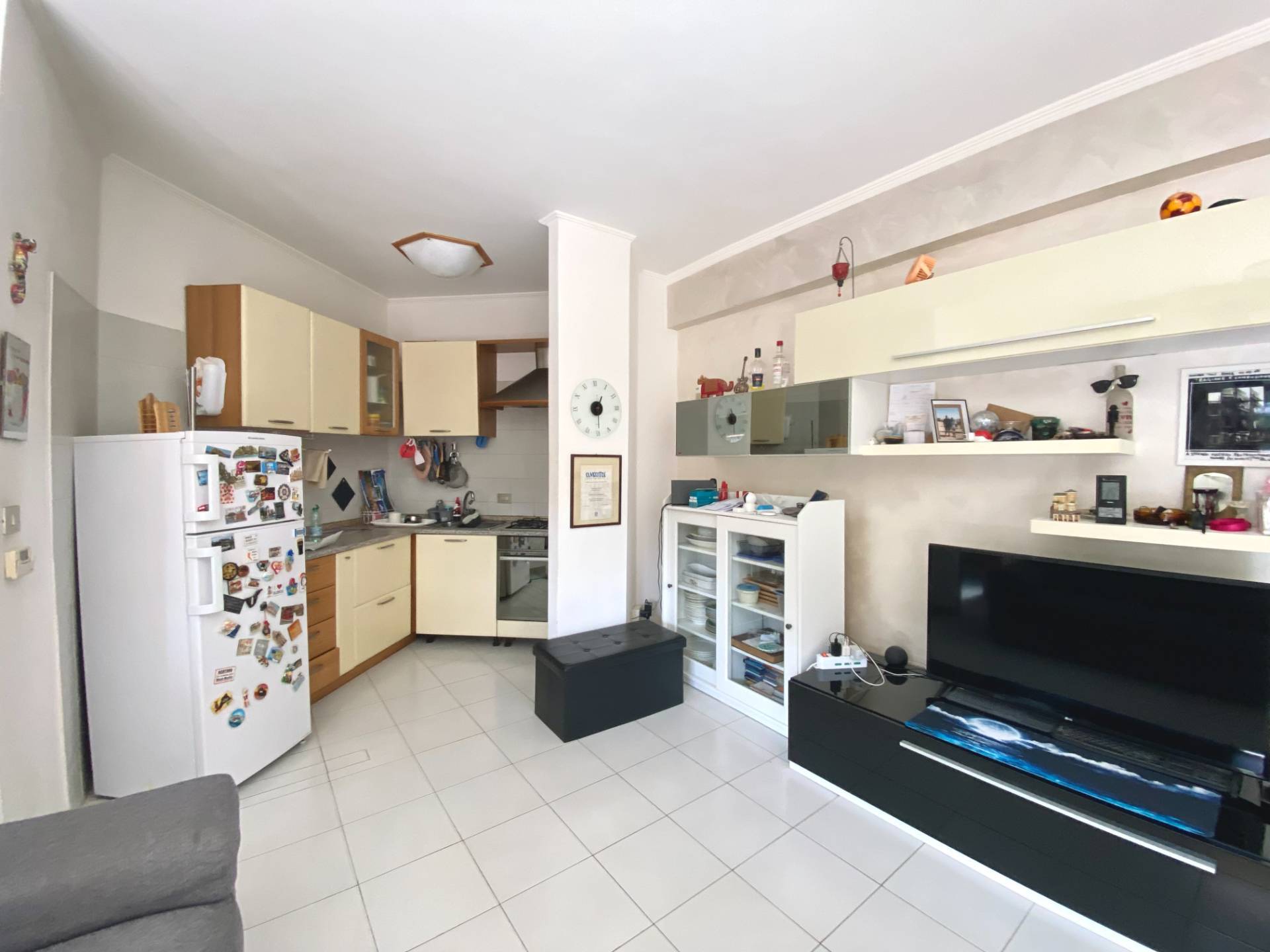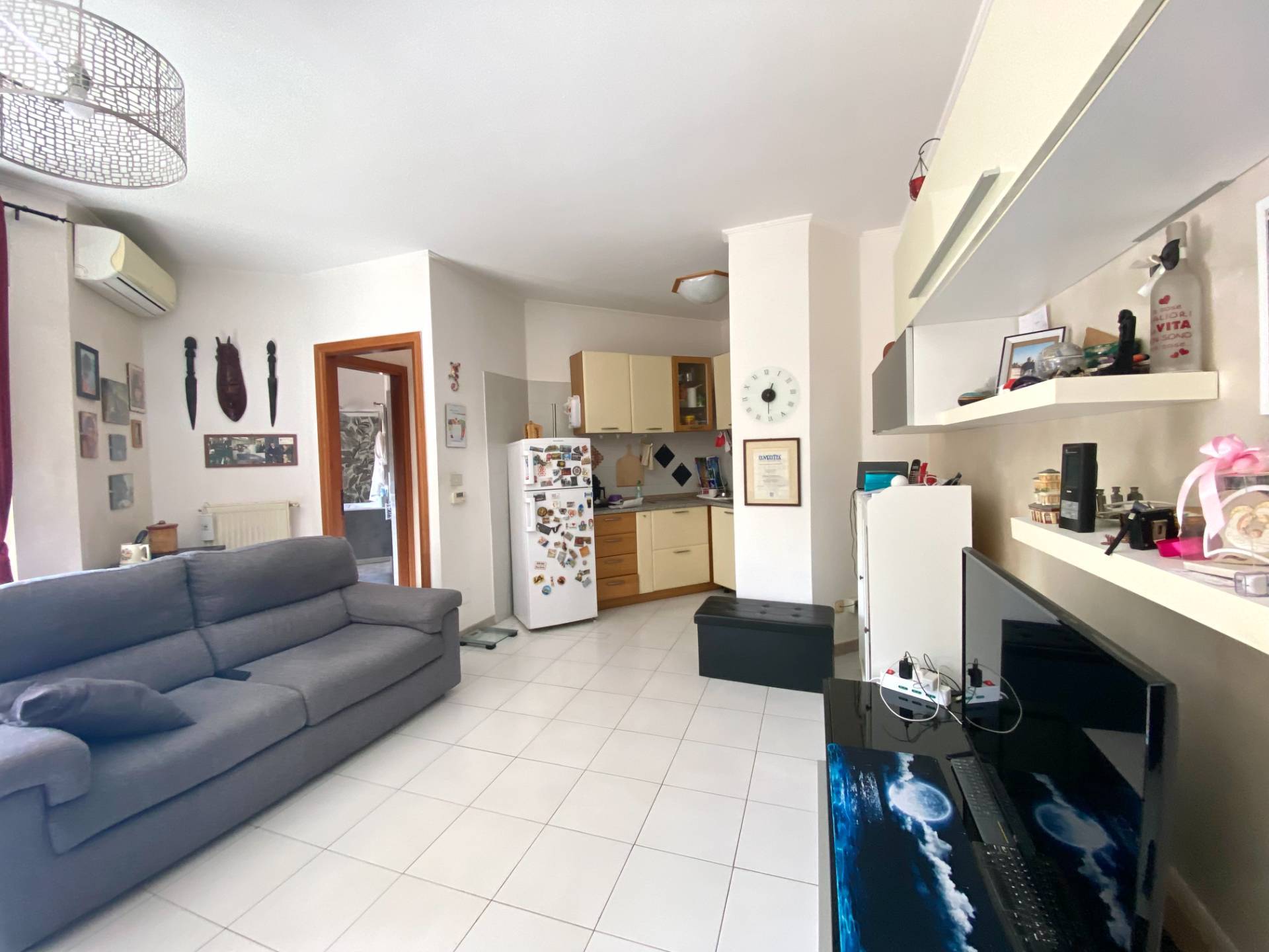 L'appartamento si apre su un soggiorno accogliente e luminoso che include una pratica cucina a vista, il tutto con accesso diretto al terrazzo.
