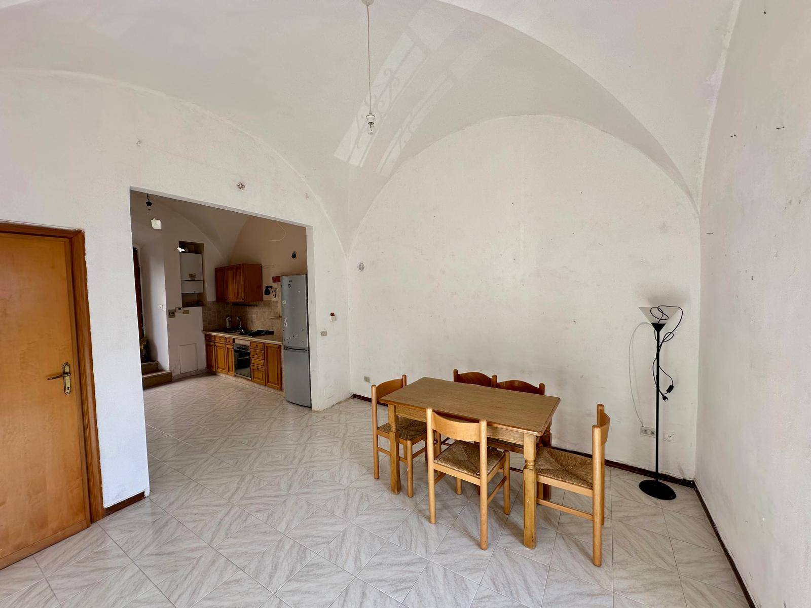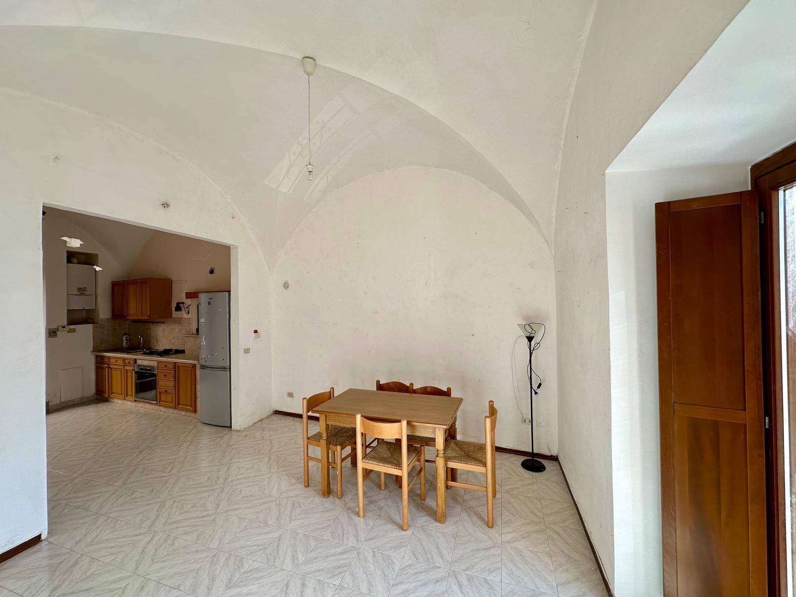 Una scala a chiocciola ci conduce al piano inferiore dove troviamo un disimpegno e una camera matrimoniale rifinita con soffitto con volte a croce.