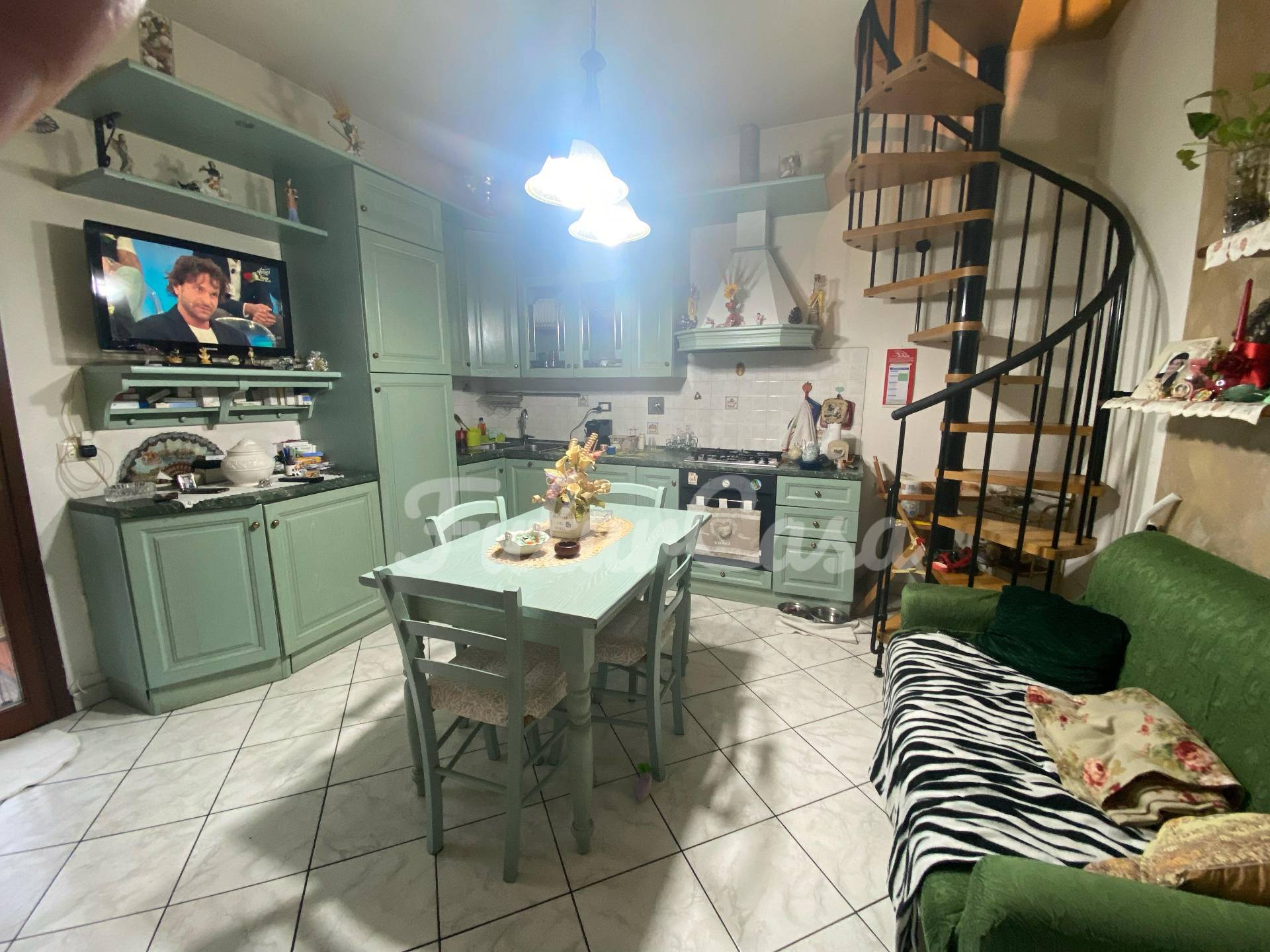 Composizine interna : ingresso in cucina-soggiorno con affaccio su ampia terrazza pavimentata che offre uno spazio esterno ampio da poter essere utilizzata per diverse attivit, come mangiare all'aperto e rilassarsi; camera matrimoniale con affaccio su balcone, bagno con box doccia, oltre ad una soffitta raggiungibile da scala a chiocciola.
