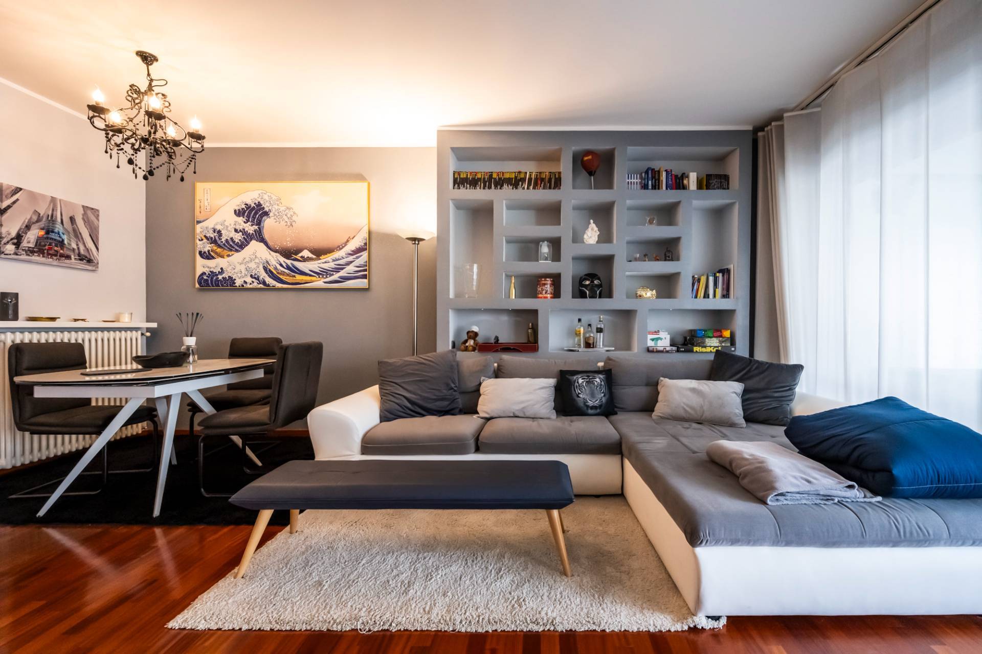 L'appartamento, caratterizzato da una doppia esposizione angolare (Nord-Ovest), gode di una luminosit straordinaria e si articola in: Zona giorno: un ampio soggiorno con terrazzo coperto di 20 m, una cucina abitabile, un pratico ripostiglio e un bagno con zona lavanderia.