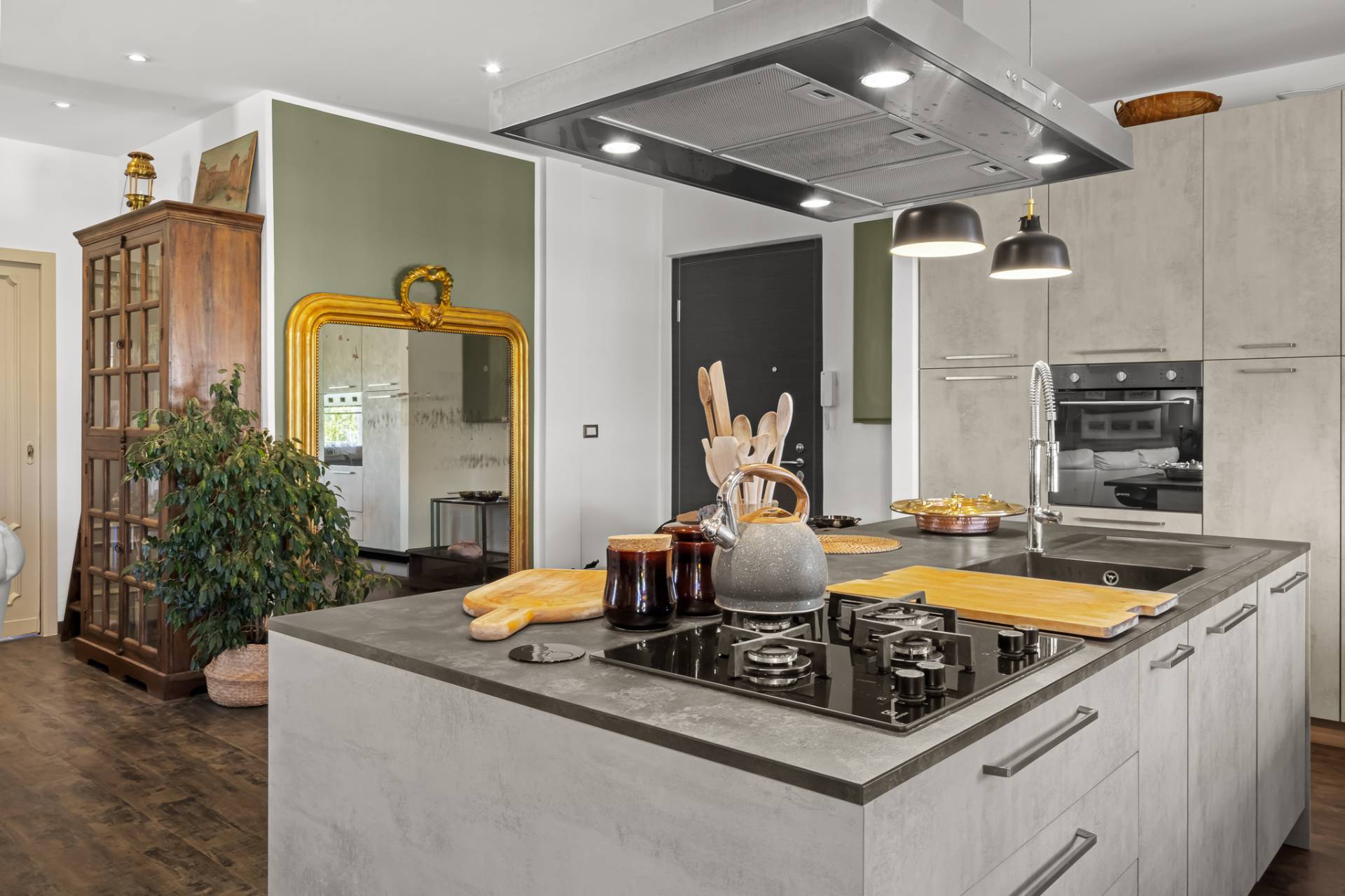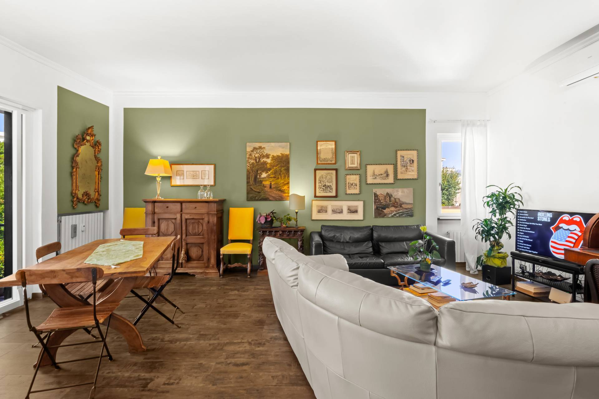 La zona giorno, ampia e accogliente, ospita un raffinato soggiorno con area pranzo e una moderna cucina a vista, perfettamente integrata nello spazio living.