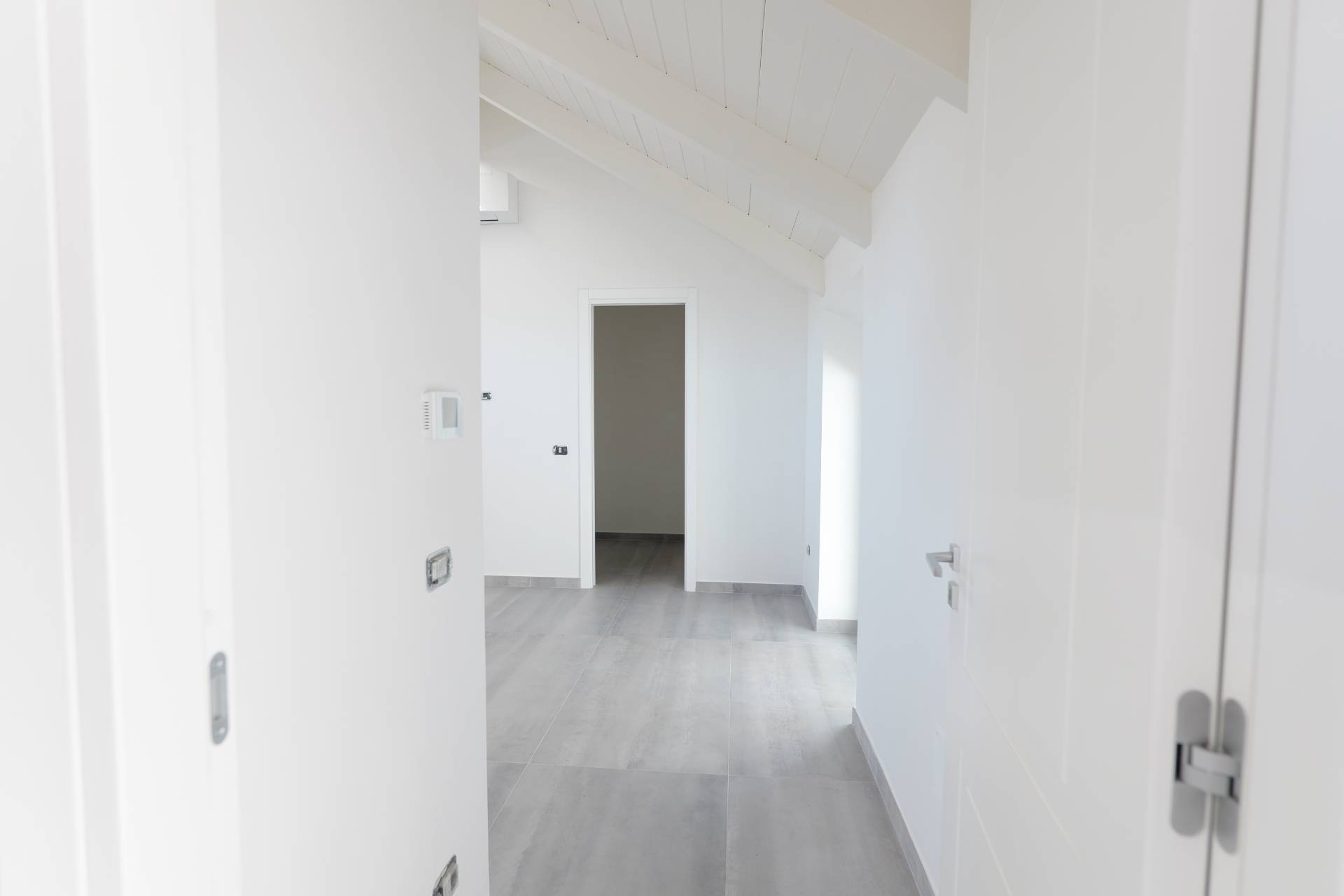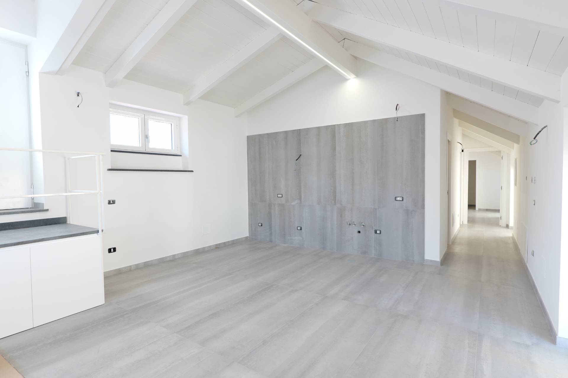 Lingresso si apre direttamente su una zona open space con cucina, uno spazio contemporaneo e funzionale che rappresenta il fulcro della casa e accompagna in modo fluido alla zona notte.