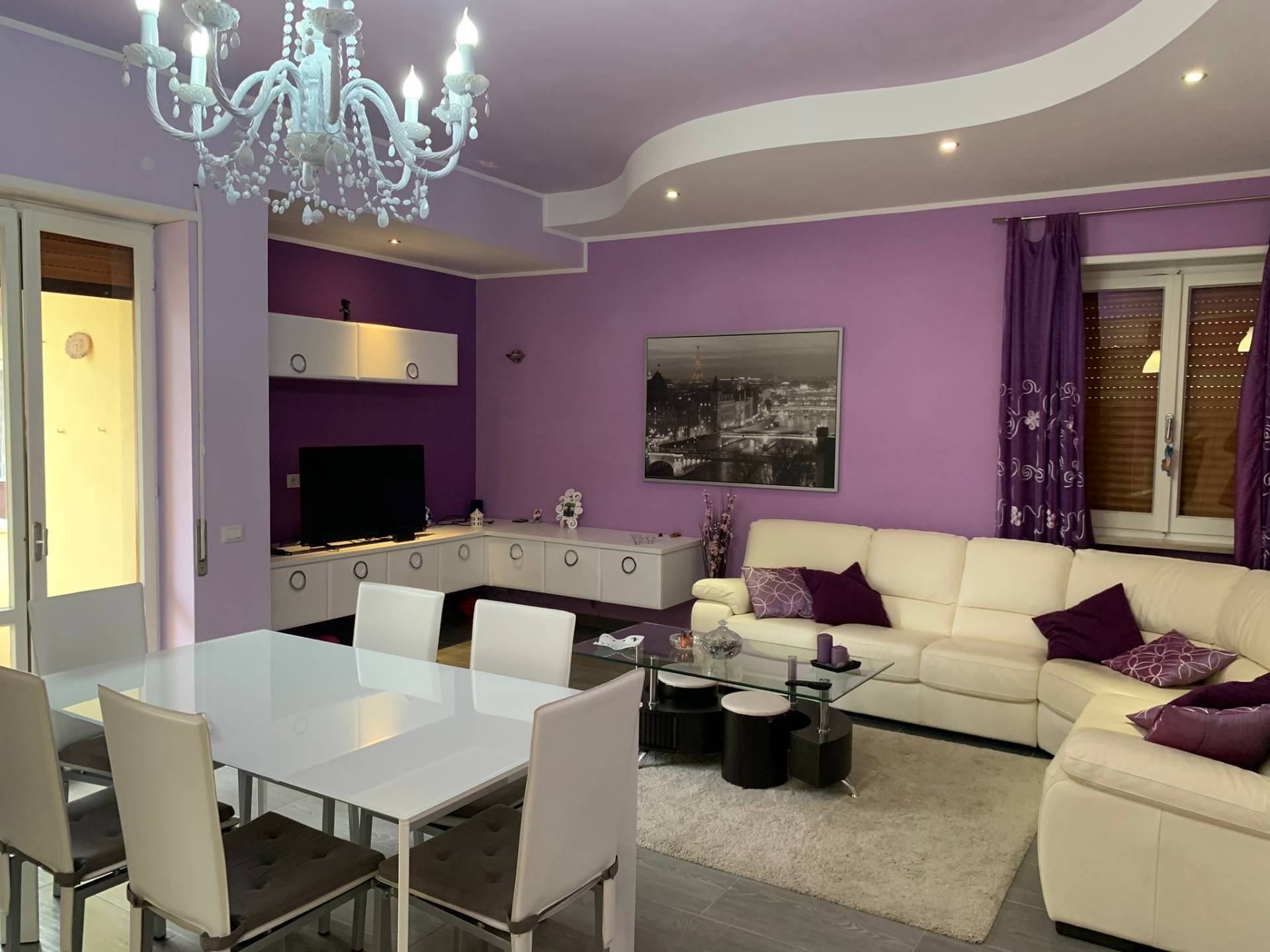 L'ingresso principale si apre su un accogliente e luminoso soggiorno, arredato con gusto e dotato di un comodo divano e di una moderna zona pranzo.
