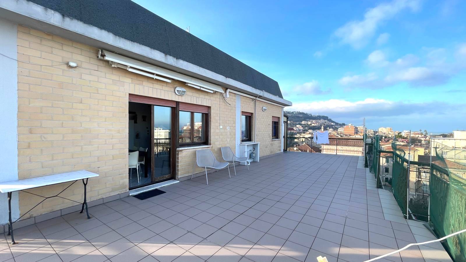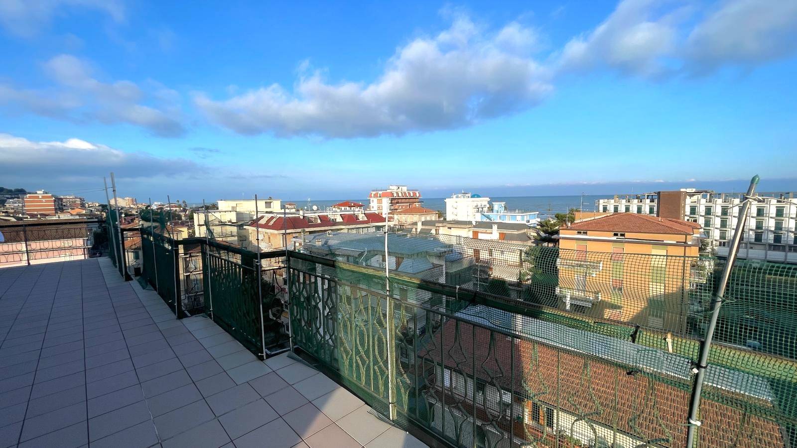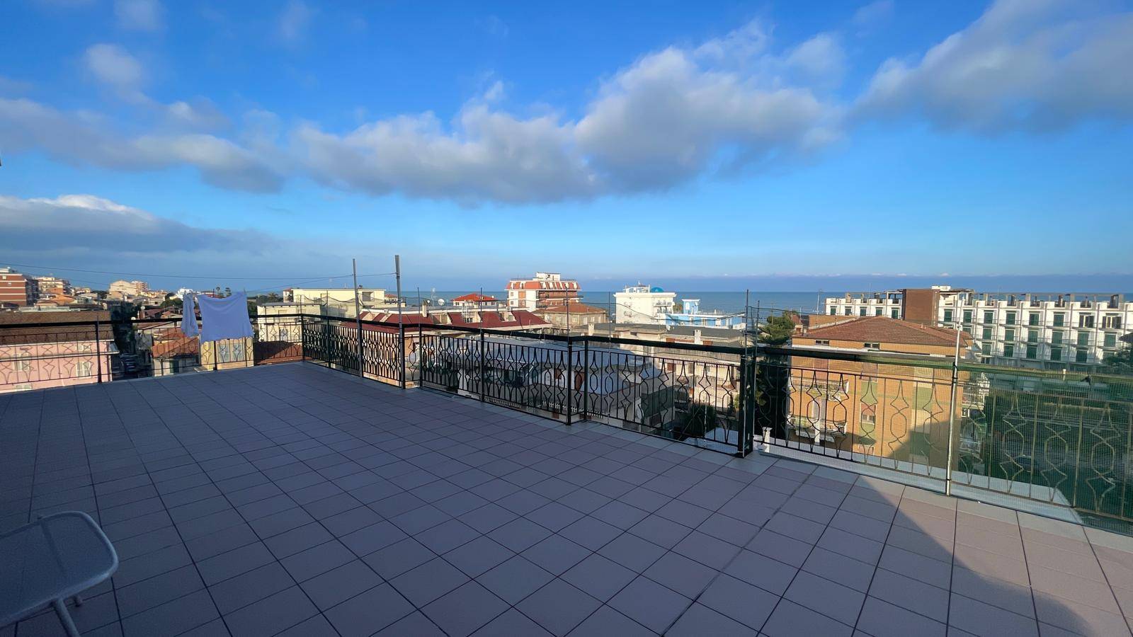 Attico al Piano Quinto servito da ascensore, delle dimensioni di 76 mq circa, composto da ingresso su soggiorno, cucina solo cottura, due camere da letto matrimoniali e bagno finestrato con doccia, oltre splendida terrazza vista mare di 100 mq. circa.