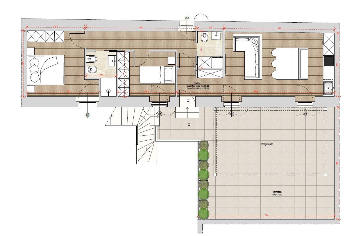 Completa la propriet una corte pavimentata di 27 mq con possibilit di pergola in legno gi approvata da progetto.