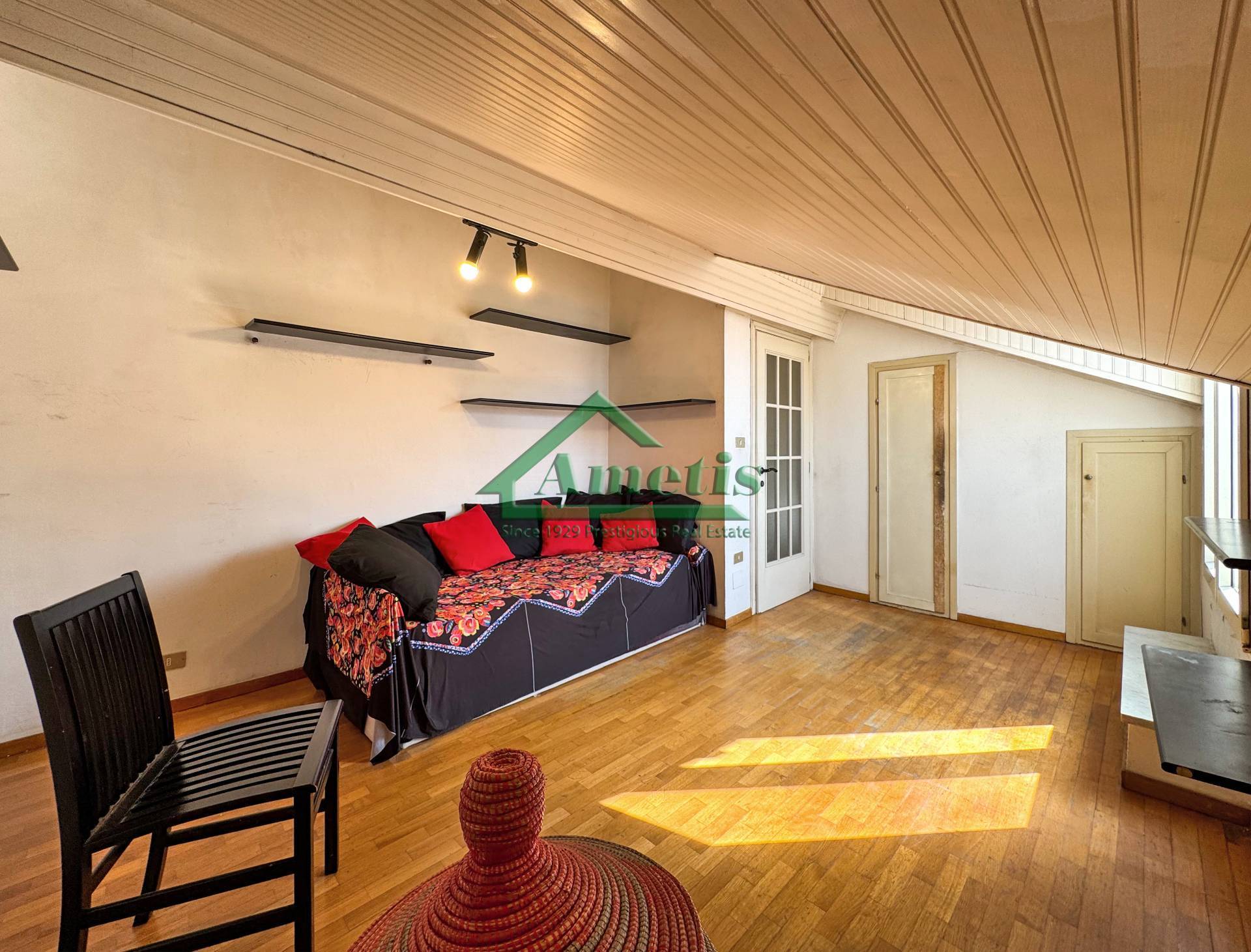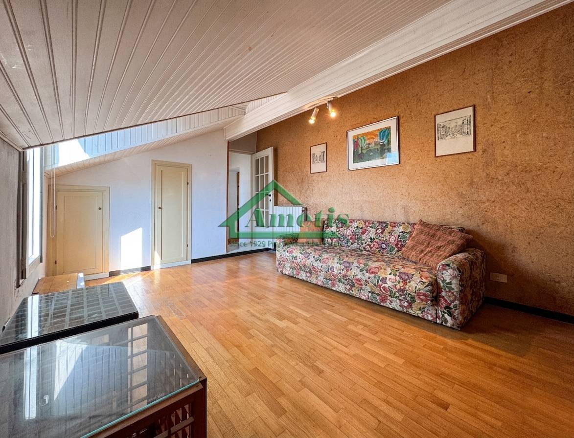 L'appartamento, mansardato, gode di una doppia esposizione: a sud, con vista sui tetti di Via Bonfante, ed a nord con vista sulla citt e la vallata.