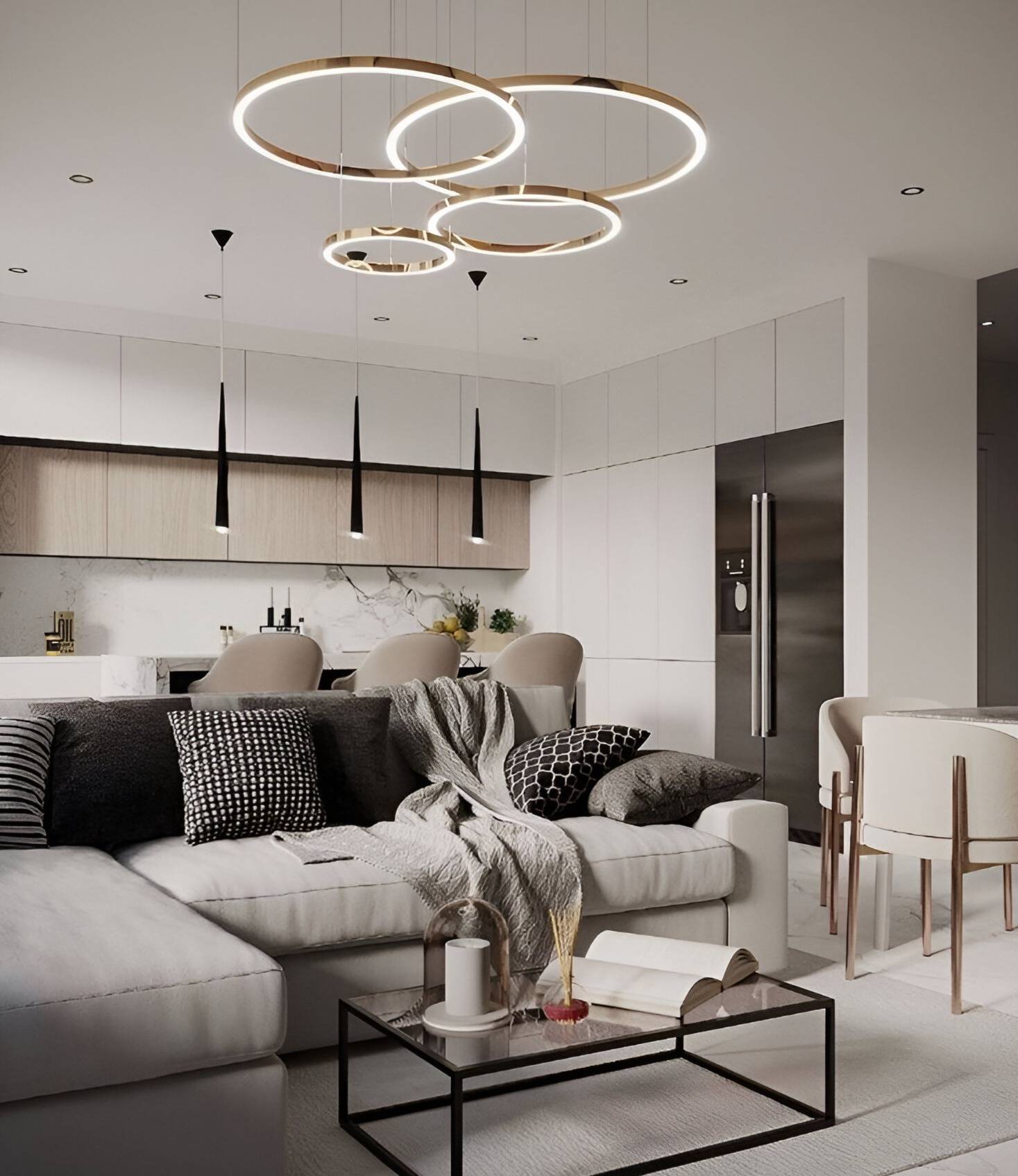 La zona giorno, luminosa e accogliente, ospita soggiorno e area pranzo in un ambiente armonioso, ideale per la vita quotidiana e per momenti di convivialit.