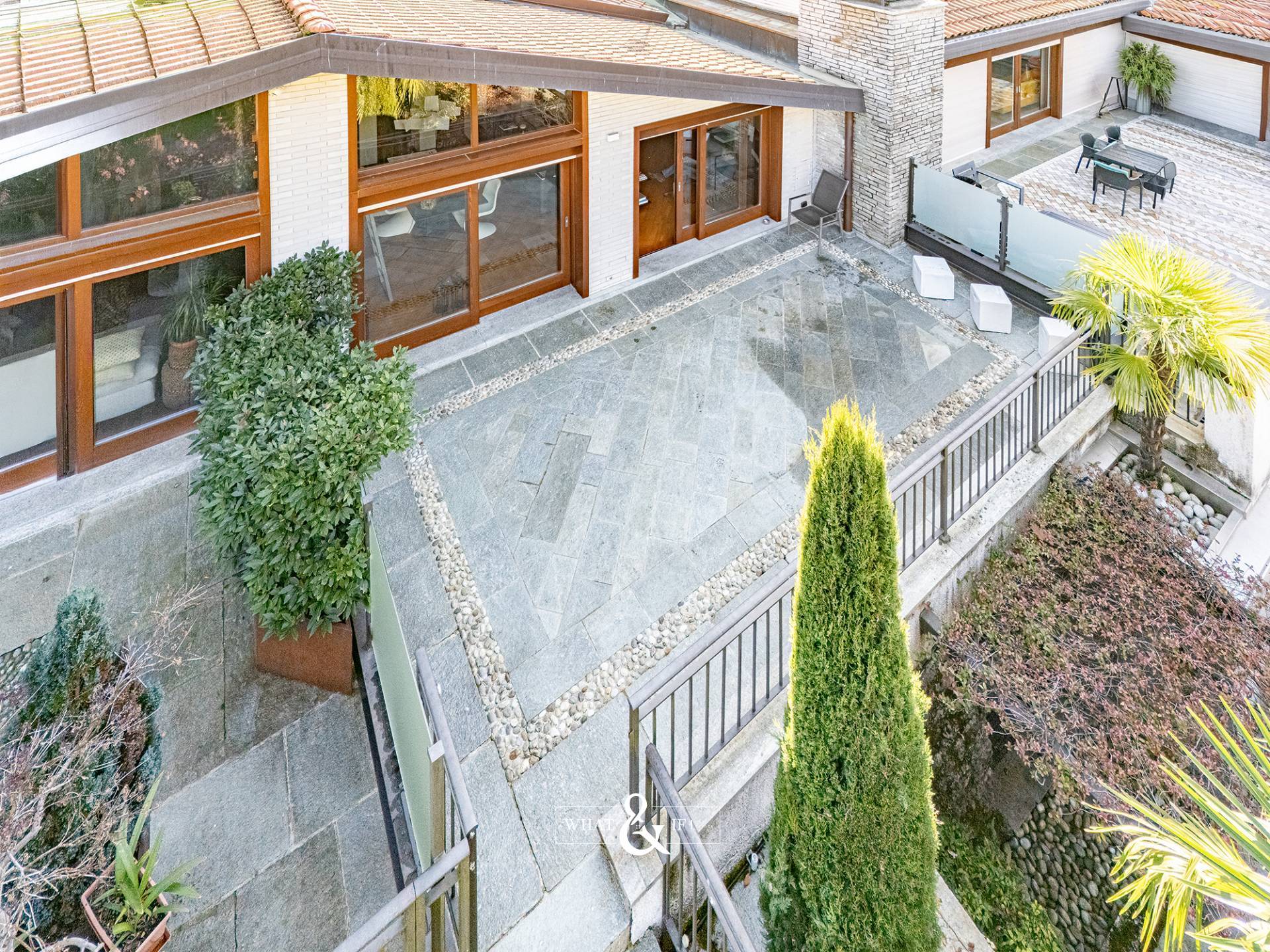 In una bellissima villa degli anni 80, suddivisa in 7 unit immobiliari, proponiamo appartamento di design con ampio terrazzo affacciato sul parco della residenza.