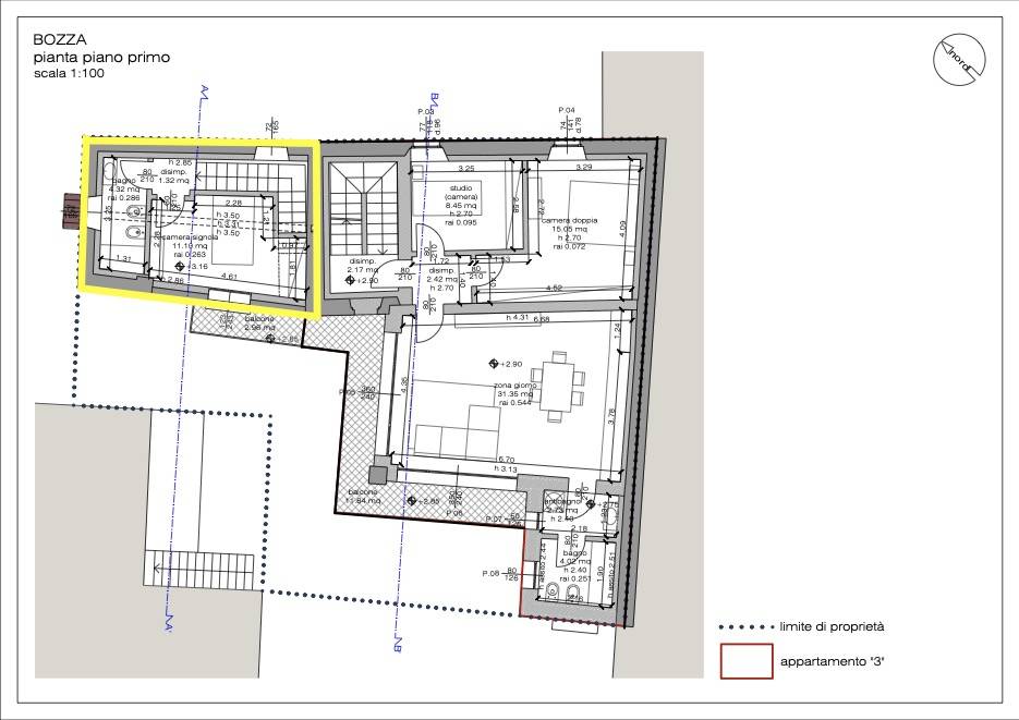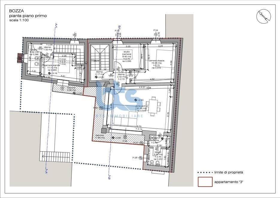 Al piano primo il trilocale si compone di una ampia zona giorno (caratterizzata da una doppia altezza), due camere, lavanderia, bagno e balcone perimetrale.