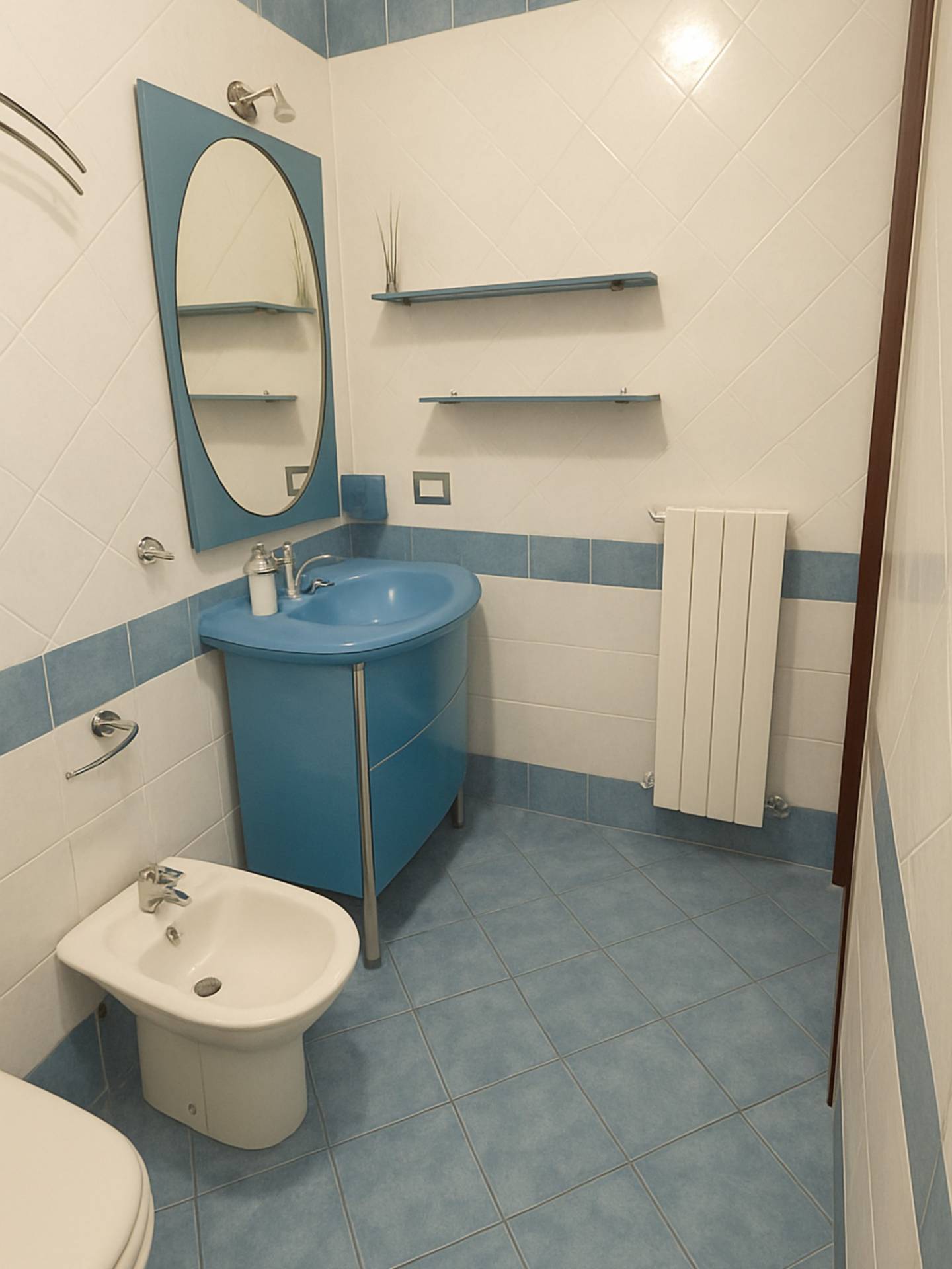 Limmobile si compone di:ingresso accogliente, ampio soggiorno con cucina a vista, disimpegno, camera matrimoniale con bagno privato, seconda camera con due letti, secondo bagno finestrato, pratico ripostiglio con zona lavanderia Completa la propriet una splendida terrazza con affaccio sul viale principale e suggestivo scorcio di vista mare. Dotazioni: riscaldamento autonomo con termosifoni, impianto di climatizzazione con 2 split, completamente arredato.