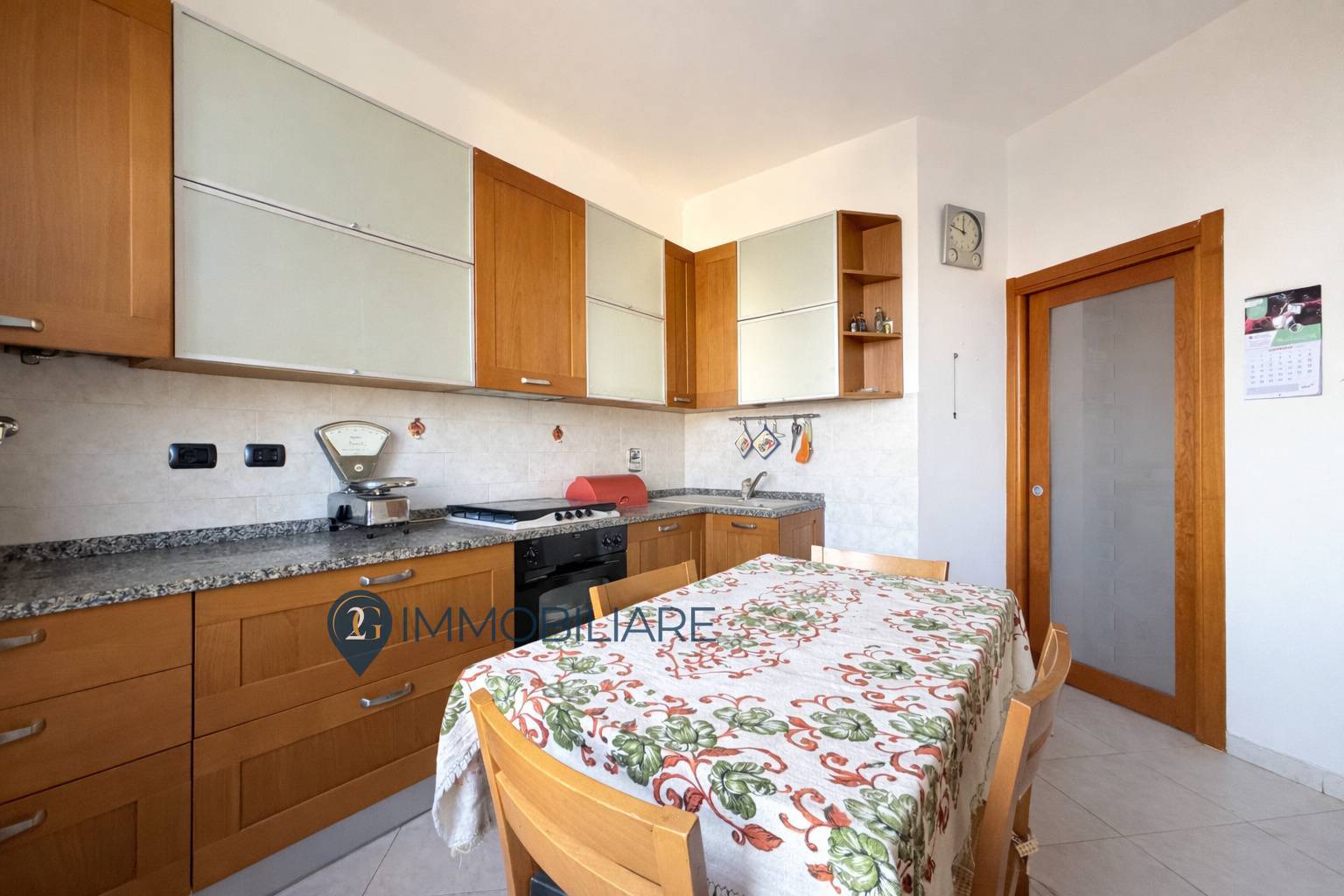 La cucina abitabile e comunicante con la sala tramite una elegante porta scorrevole in vetro satinato, soluzione pratica e raffinata che garantisce continuit degli spazi.