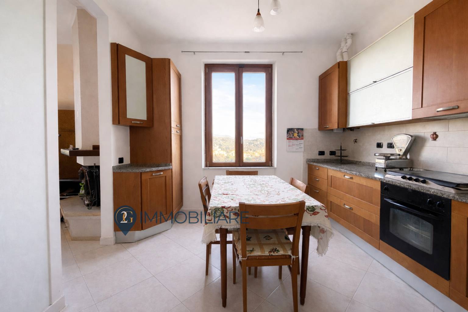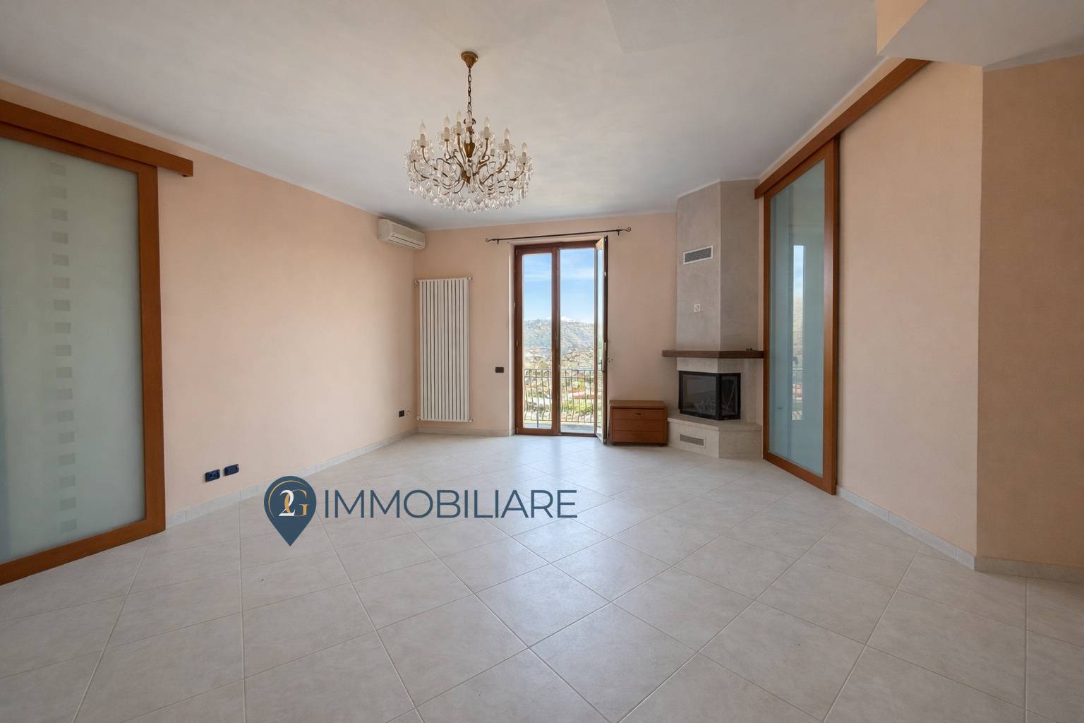 Lingresso, dotato di portone blindato, si apre su un ampio soggiorno con camino funzionante e accesso diretto alla balconata panoramica, che dona grande luminosit allambiente.