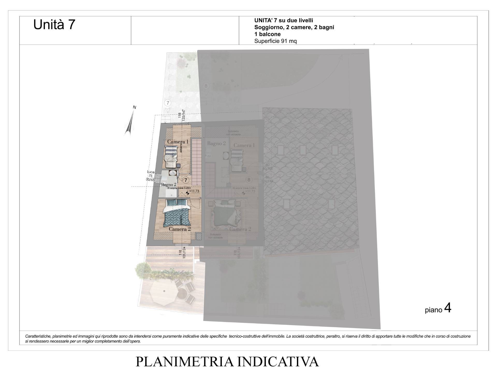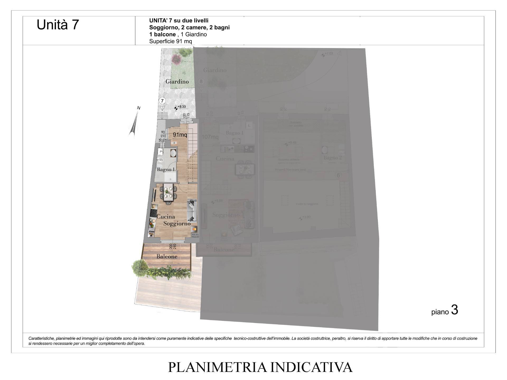 L'unit 7 un duplex composta da ingresso su soggiorno con cucina a vista, un bagno, un balcone e un piccolo giardino al secondo piano e due camere e un bagno al piano mansardato, con una splendida vista dall'abbaino sul Grand Assaly e sul ghiacciaio del Rutor con le sue famose cascate.