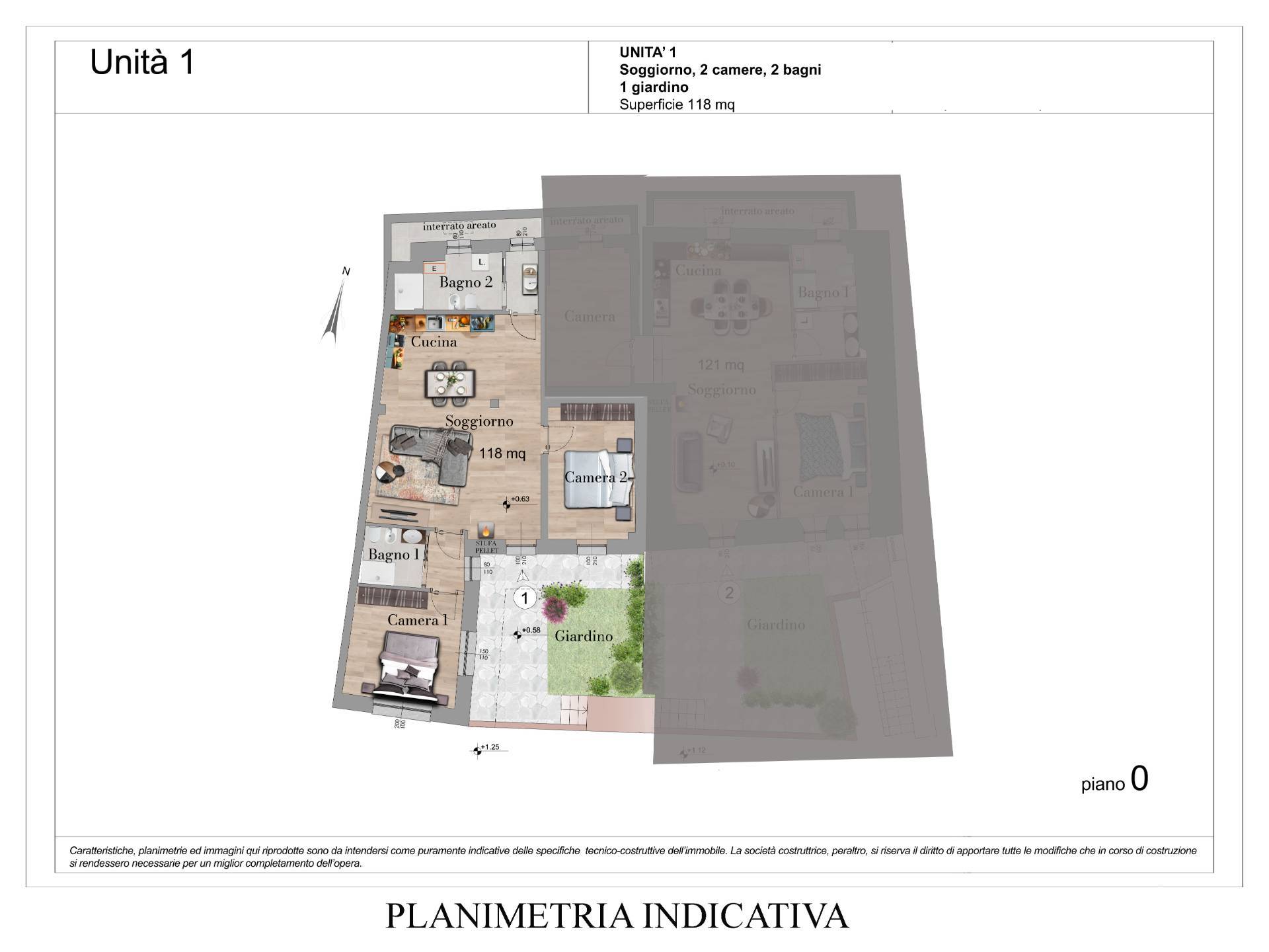 L'unit 1 si trova al piano terra ed composta da ingresso su soggiorno con cucina a vista, due camere, due bagni e un piccolo giardino privato.