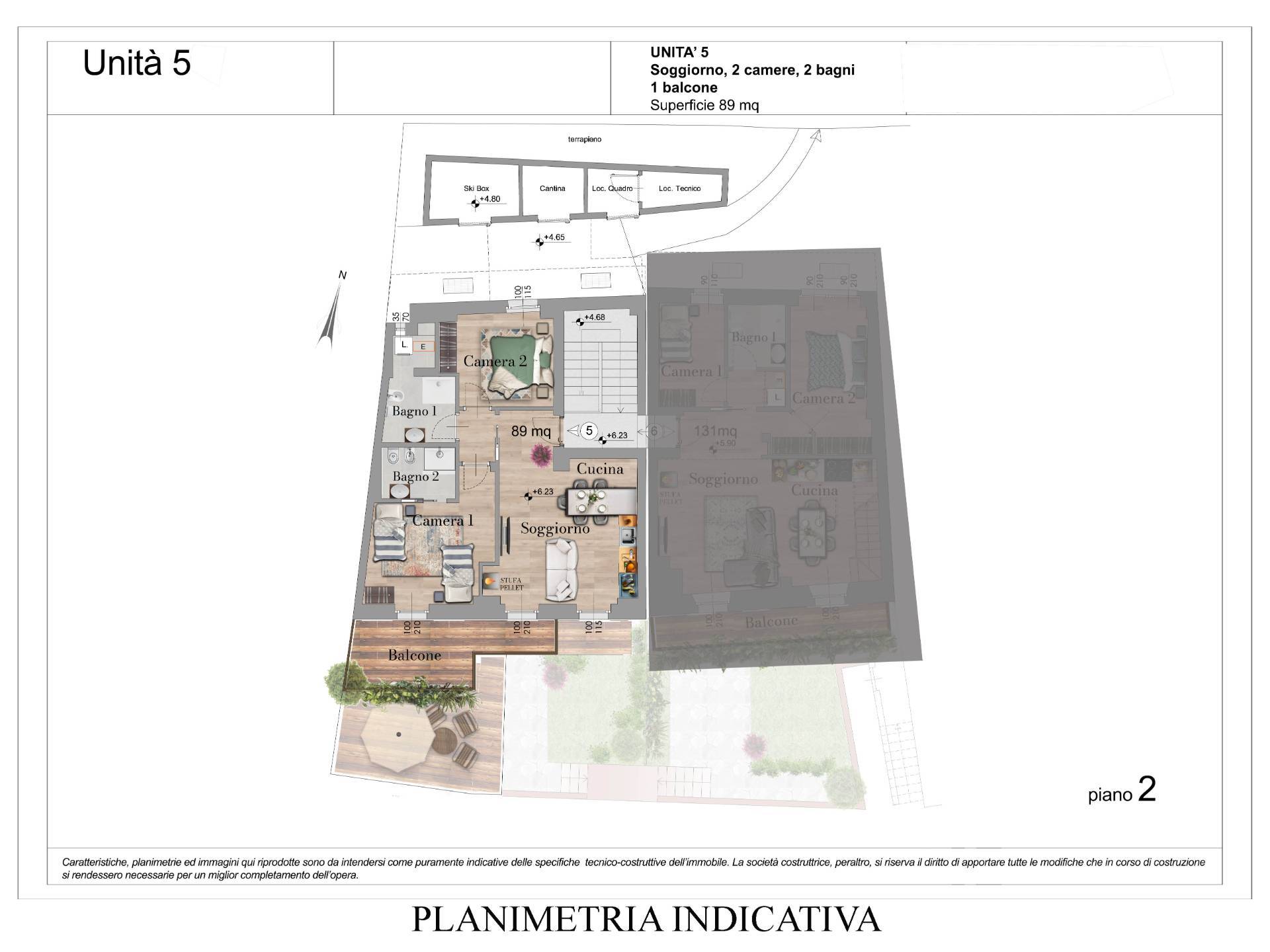 L'unit 5 si trova al secondo piano ed composta da ingresso su soggiorno con cucina a vista, due camere, due bagni e un ampio balcone, con splendida vista sul Grand Assaly e sul ghiacciaio del Rutor con le sue famose cascate.