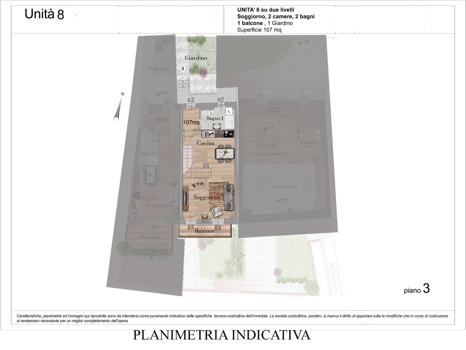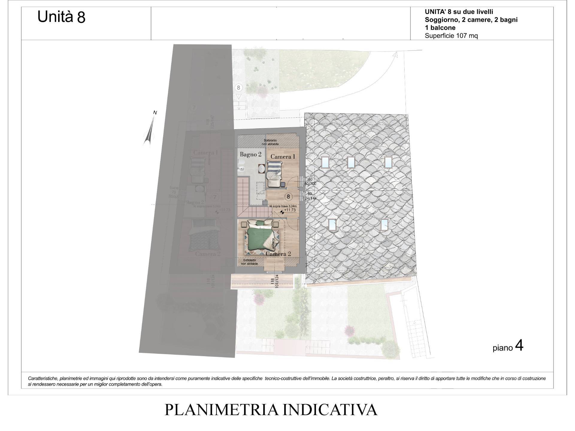 L'unit 8 un duplex composta da ingresso su soggiorno con cucina a vista, un bagno, un balcone e un piccolo giardino al secondo piano e due camere e un bagno al piano mansardato, con una splendida vista dall'abbaino sul Grand Assaly e sul ghiacciaio del Rutor con le sue famose cascate.