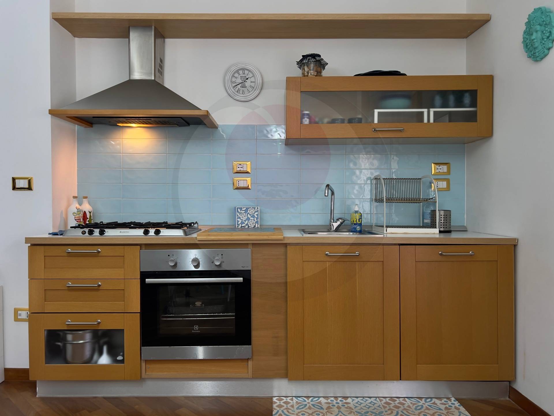 Ingresso su luminosa zona giorno con ampio guardaroba e cucina a vista, ben illuminata da una comoda porta finestra con affaccio su balcone.