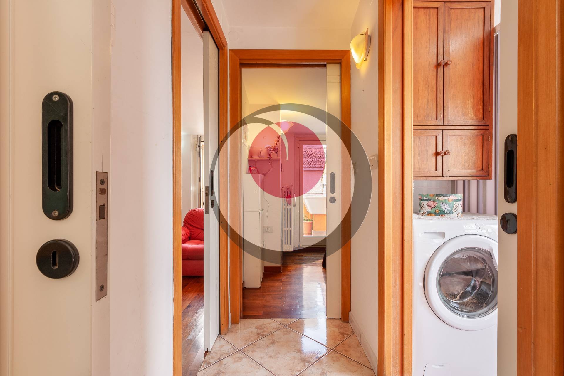 Ingresso su comoda zona giorno con cucina a vista, disimpegno, due camere con affaccio su terrazzino e bagno con vasca.