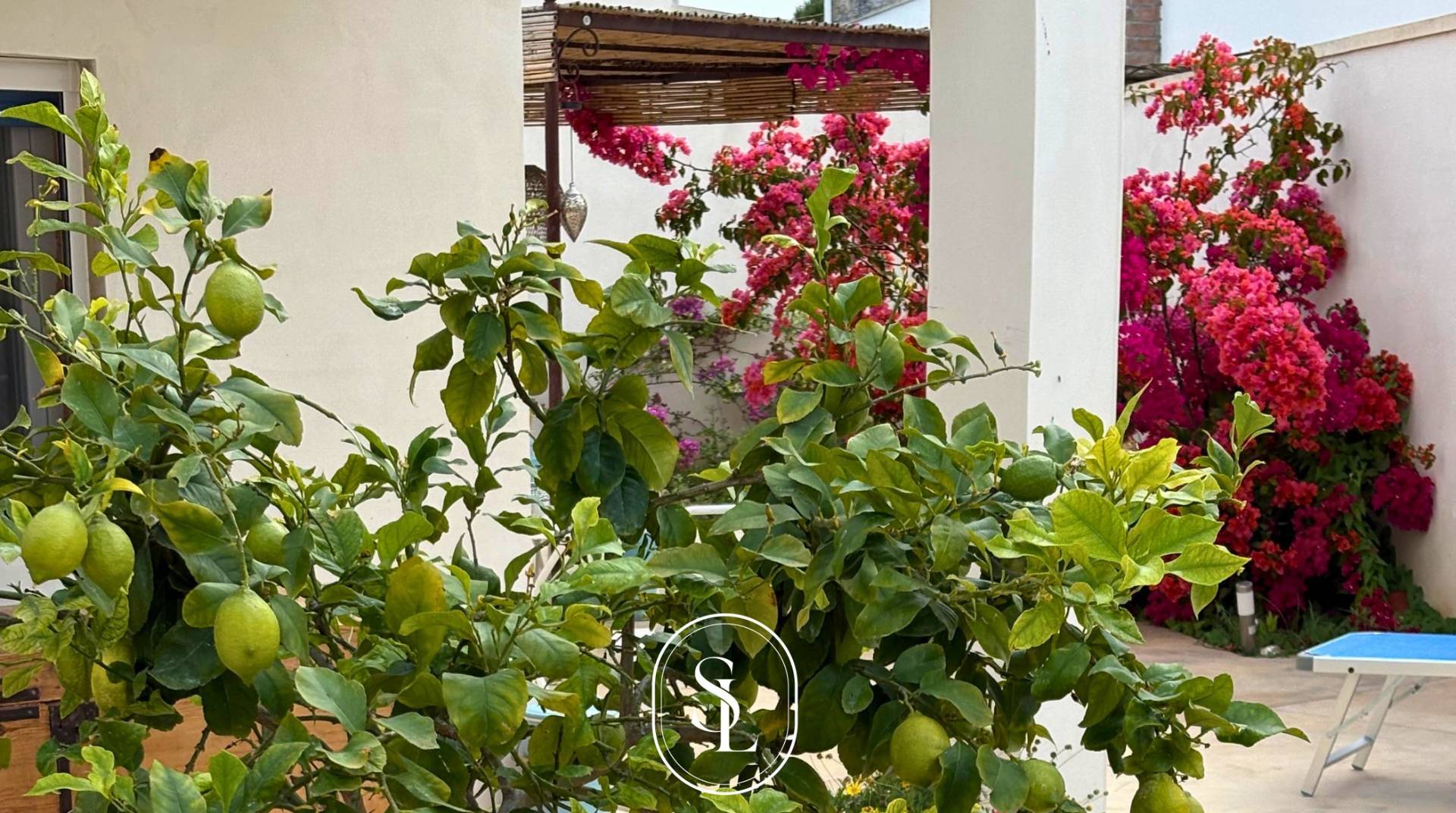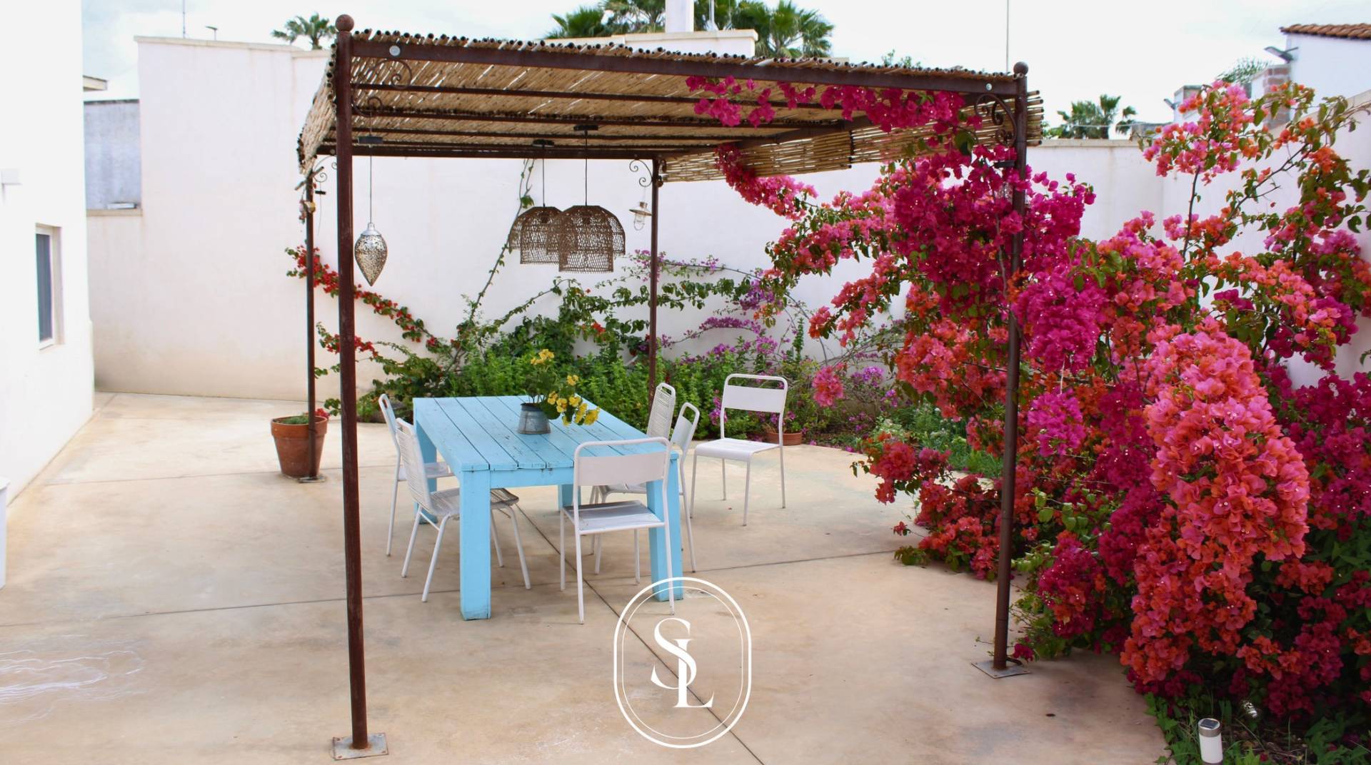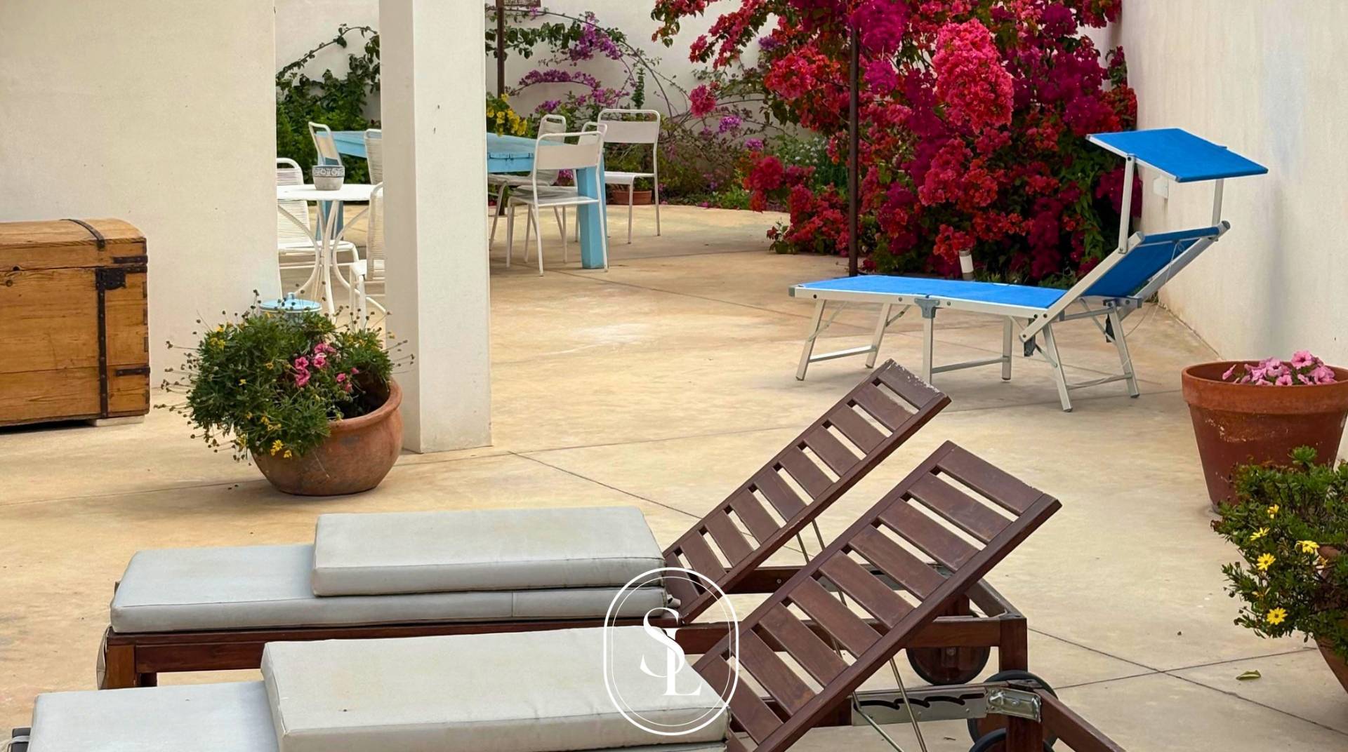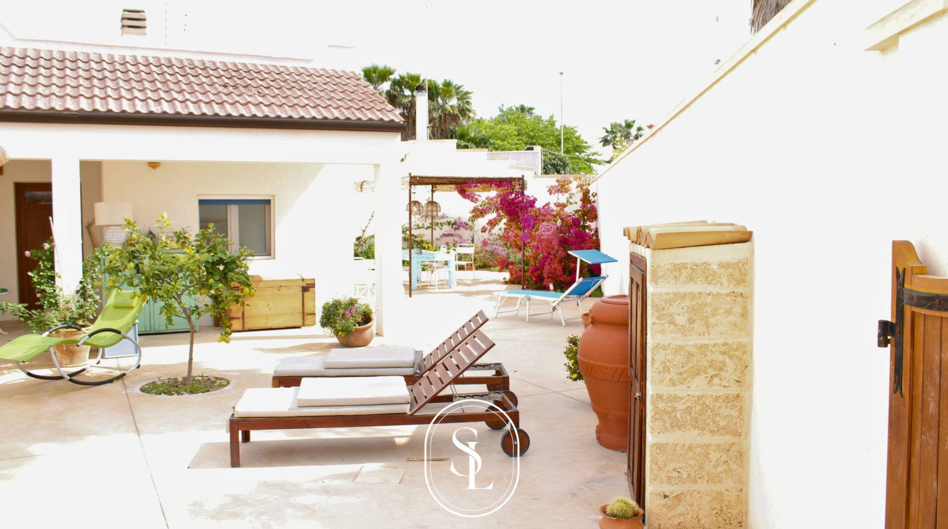 Laccesso avviene tramite un suggestivo portone in legno che conduce a uno spazio esterno recintato, in parte pavimentato e in parte adibito a giardino di circa 350 mq, dove si respira unatmosfera di relax e privacy.
